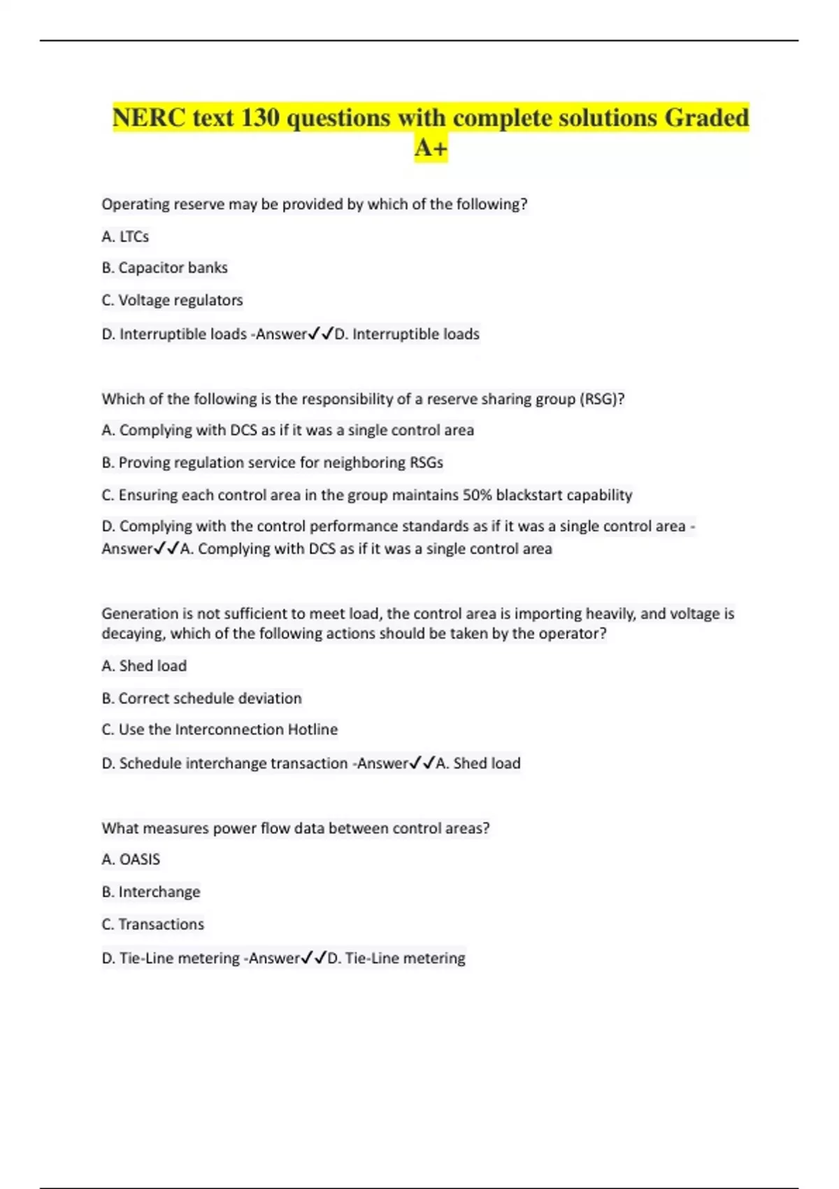 Operating reserve may be provided by which of the following? A. LTCs B. Capacitor banks C. Voltage regulators D. Interruptible loads -AnswerD. Interruptible loads Which of the following is the responsibility of a reserve sharing group (RSG)? A. Complying with DCS as if it was a single control area B. Proving regulation service for neighboring RSGs C. Ensuring each control area in the group maintains 50% blackstart capability D. Complying with the control performance standards as if it was a single control area - AnswerA. Complying with DCS as if it was a single control area Generation is not sufficient to meet load, the control area is importing heavily, and voltage is decaying, which of the following actions should be taken by the operator? A. Shed load B. Correct schedule deviation C. Use the Interconnection Hotline D. Schedule interchange transaction -AnswerA. Shed load