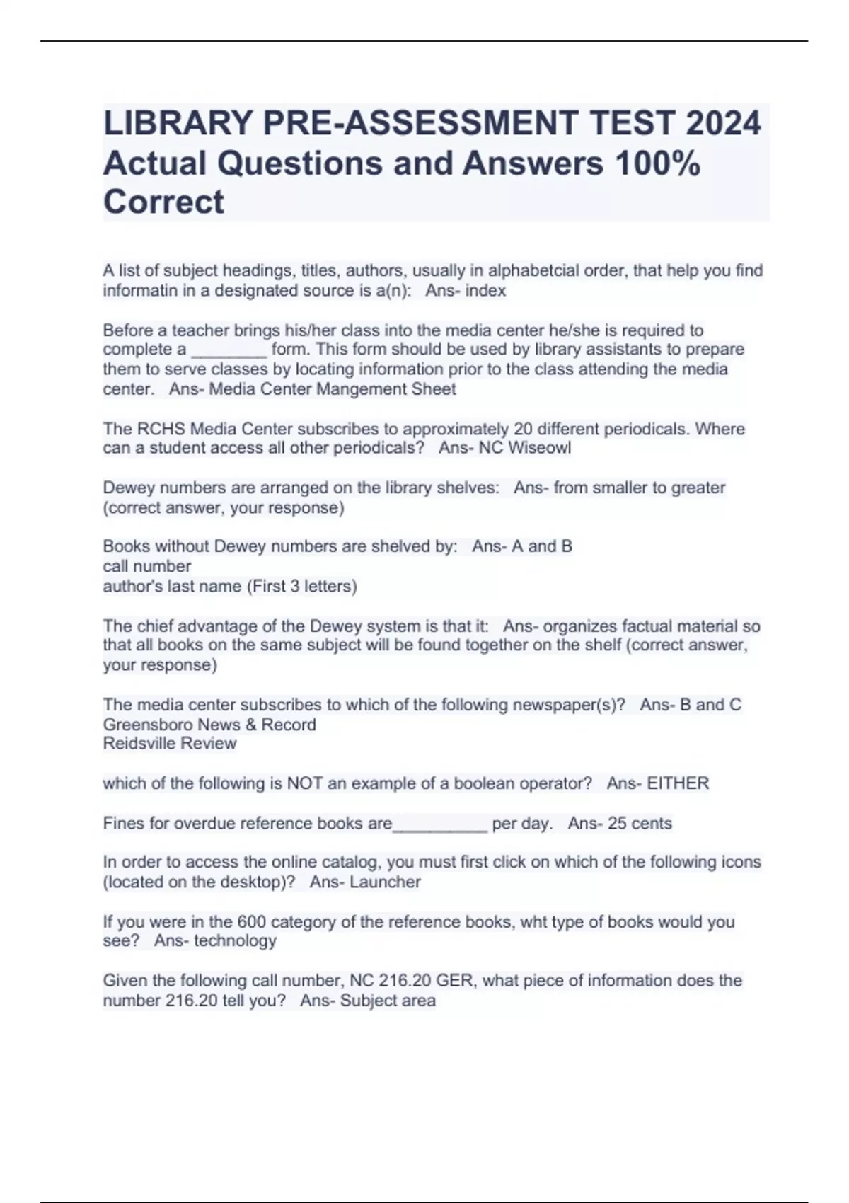 LIBRARY PRE-ASSESSMENT TEST 2024 Actual Questions and Answers 100% Correct