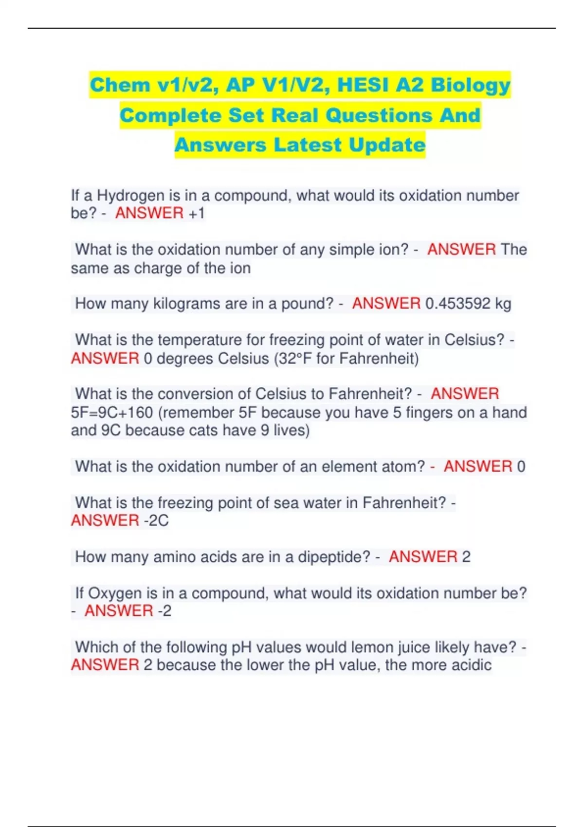 Chem v1/v2, AP V1/V2, HESI A2 Biology Complete Set Real Questions And Answers Latest Update If a Hydrogen is in a compound, what would its oxidation number be? - ANSWER +1 What is the oxidation number of any simple ion? - ANSWER The same as charge of the ion How many kilograms are in a pound? - ANSWER 0.453592 kg What is the temperature for freezing point of water in Celsius? - ANSWER 0 degrees Celsius (32°F for Fahrenheit) What is the conversion of Celsius to Fahrenheit? - ANSWER 5F=9C+160 (remember 5F because you have 5 fingers on a hand and 9C because cats have 9 lives) What is the oxidation number of an element atom? - ANSWER 0 What is the freezing point of sea water in Fahrenheit? - ANSWER -2C How many amino acids are in a dipeptide? - ANSWER 2 If Oxygen is in a compound, what would its oxidation number be? - ANSWER -2 Which of the following pH values would lemon juice likely have? - ANSWER 2 because the lower the pH value, the more acidic What is a pentose? - ANSWER A 5 carbon sugar (Pent = 5) (ose = sugar) What is the oxidation state of the Sulfur atom in Sulfuric Acid H2SO4? - ANSWER 6(each H is +1, each O is -2. All charges have to add to 0. 2+S-8=0 How many neutrons does carbon 14 have? - ANSWER 8 ( mass# - atomics # = neutrons) 14 6= 8 How many protons does Potassium have? - ANSWER 19