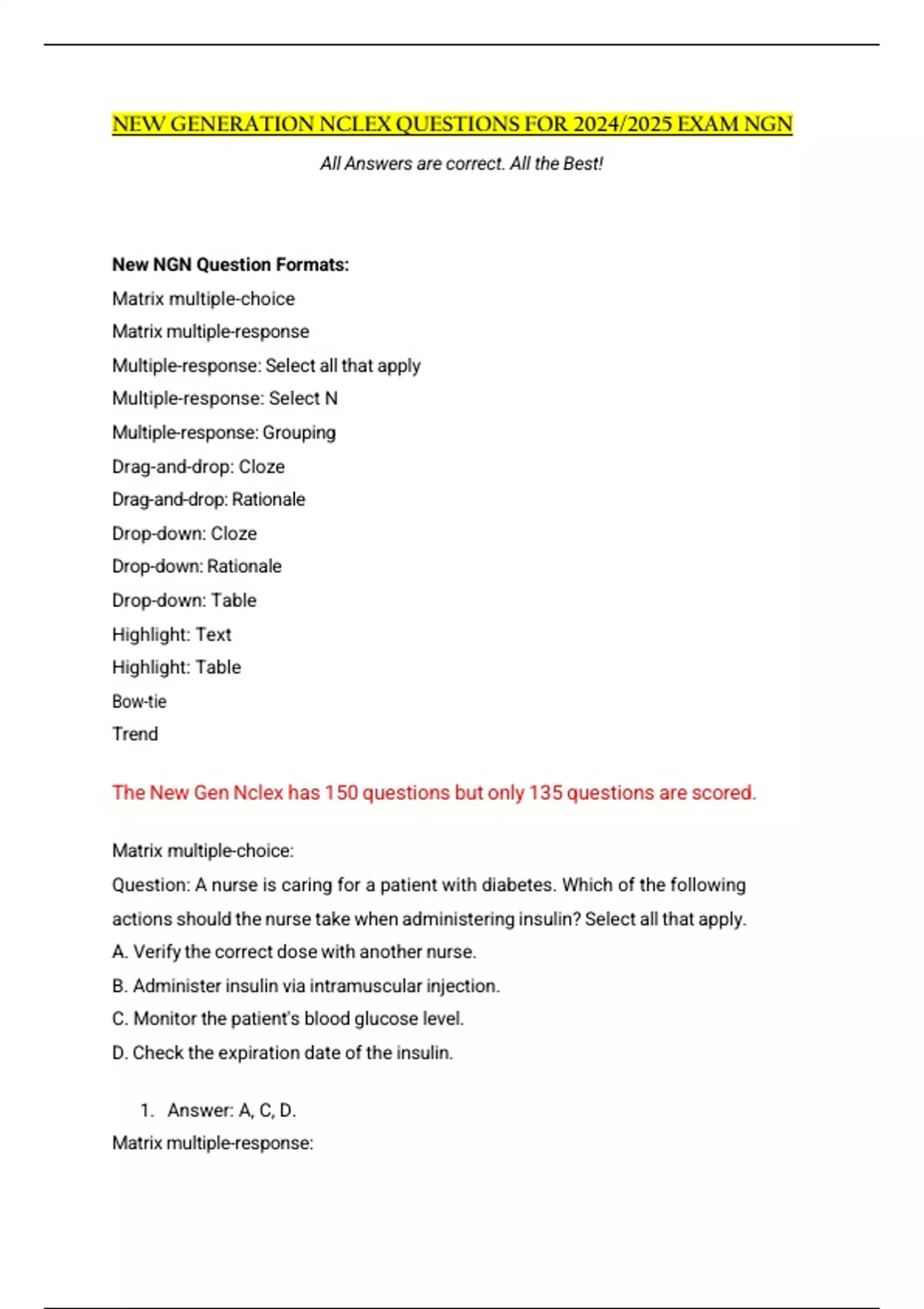 NEW GENERATION NCLEX QUESTIONS FOR 2024/2025 EXAM WITH NGN [COMPLETE VERSION]
