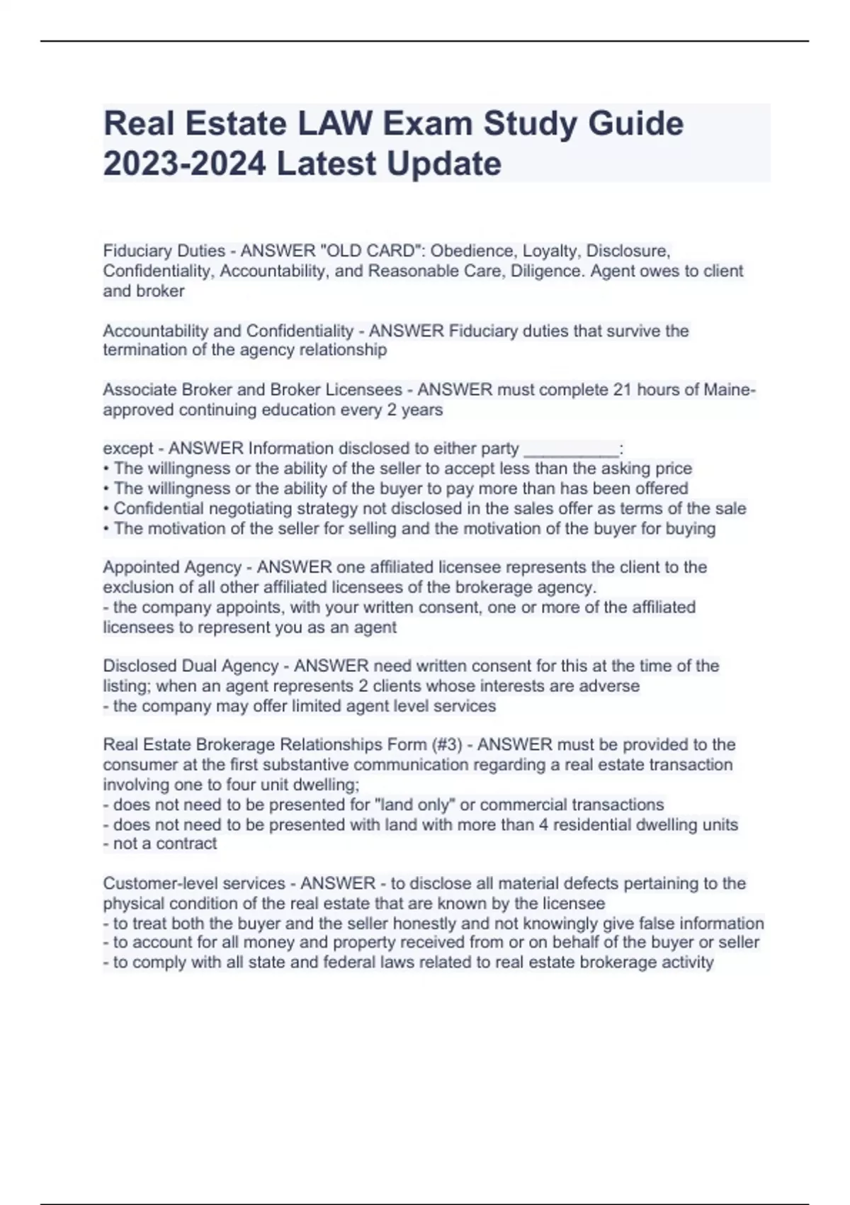 Fiduciary Duties - ANSWER "OLD CARD": Obedience, Loyalty, Disclosure, Confidentiality, Accountability, and Reasonable Care, Diligence. Agent owes to client and broker Accountability and Confidentiality - ANSWER Fiduciary duties that survive the termination of the agency relationship Associate Broker and Broker Licensees - ANSWER must complete 21 hours of Maine-approved continuing education every 2 years except - ANSWER Information disclosed to either party __________: • The willingness or the ability of the seller to accept less than the asking price • The willingness or the ability of the buyer to pay more than has been offered • Confidential negotiating strategy not disclosed in the sales offer as terms of the sale • The motivation of the seller for selling and the motivation of the buyer for buying Appointed Agency - ANSWER one affiliated licensee represents the client to the exclusion of all other affiliated licensees of the brokerage agency. - the company appoints, with your written consent, one or more of the affiliated licensees to represent you as an agent Disclosed Dual Agency - ANSWER need written consent for this at the time of the listing; when an agent represents 2 clients whose interests are adverse - the company may offer limited agent level services Real Estate Brokerage Relationships Form (#3) - ANSWER must be provided to the consumer at the first substantive communication regarding a real estate transaction involving one to four unit dwelling; - does not need to be presented for "land only" or commercial transactions - does not need to be presented with land with more than 4 residential dwelling units - not a contract Customer-level services - ANSWER - to disclose all material defects pertaining to the physical condition of the real estate that are known by the licensee - to treat both the buyer and the seller honestly and not knowingly give false information - to account for all money and property received from or on behalf of the buyer or seller - to comply with all state and federal laws related to real estate brokerage activity Written listing agreement (or written buyer representation agreement) - ANSWER when you want a licensee to represent you, you will need to enter a... - creates a client-agent relationship Client-level services - ANSWER the real estate licensee's job is - to perform the terms of the written agreement with skill and care - to promote your best interests - to maintain confidentiality of specific client information including bargaining information Single agency - ANSWER company and all of its affiliated licensees represent you as a client