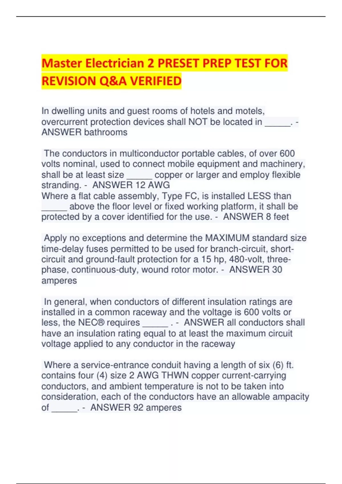 Master Electrician 2 PRESET PREP TEST FOR REVISION Q&A VERIFIED In dwelling units and guest rooms of hotels and motels, overcurrent protection devices shall NOT be located in _____. - ANSWER bathrooms The conductors in multiconductor portable cables, of over 600 volts nominal, used to connect mobile equipment and machinery, shall be at least size _____ copper or larger and employ flexible stranding. - ANSWER 12 AWG Where a flat cable assembly, Type FC, is installed LESS than _____ above the floor level or fixed working platform, it shall be protected by a cover identified for the use. - ANSWER 8 feet Apply no exceptions and determine the MAXIMUM standard size time-delay fuses permitted to be used for branch-circuit, shortcircuit and ground-fault protection for a 15 hp, 480-volt, threephase, continuous-duty, wound rotor motor. - ANSWER 30 amperes In general, when conductors of different insulation ratings are installed in a common raceway and the voltage is 600 volts or less, the NEC® requires _____ . - ANSWER all conductors shall have an insulation rating equal to at least the maximum circuit voltage applied to any conductor in the raceway Where a service-entrance conduit having a length of six (6) ft. contains four (4) size 2 AWG THWN copper current-carrying conductors, and ambient temperature is not to be taken into consideration, each of the conductors have an allowable ampacity of _____. - ANSWER 92 amperes Unless otherwise provided, Type AC cable shall be supported at intervals NOT exceeding _____ where installed on or across framing members. - ANSWER 4½ ft. Where located in Class I, Division 1 locations, transformers containing oil or a liquid that will burn shall be _____. - ANSWER installed in vaults only Where a conduit or tubing nipple has a length of NOT more than ____ it is not necessary to derate for the number of currentcarrying conductors contained in the nipple. - ANSWER 24 in. When a fiber optic cable passes through a fire-resistant-rated partition or wall it must be _____. - ANSWER firestopped With respect to service-drop