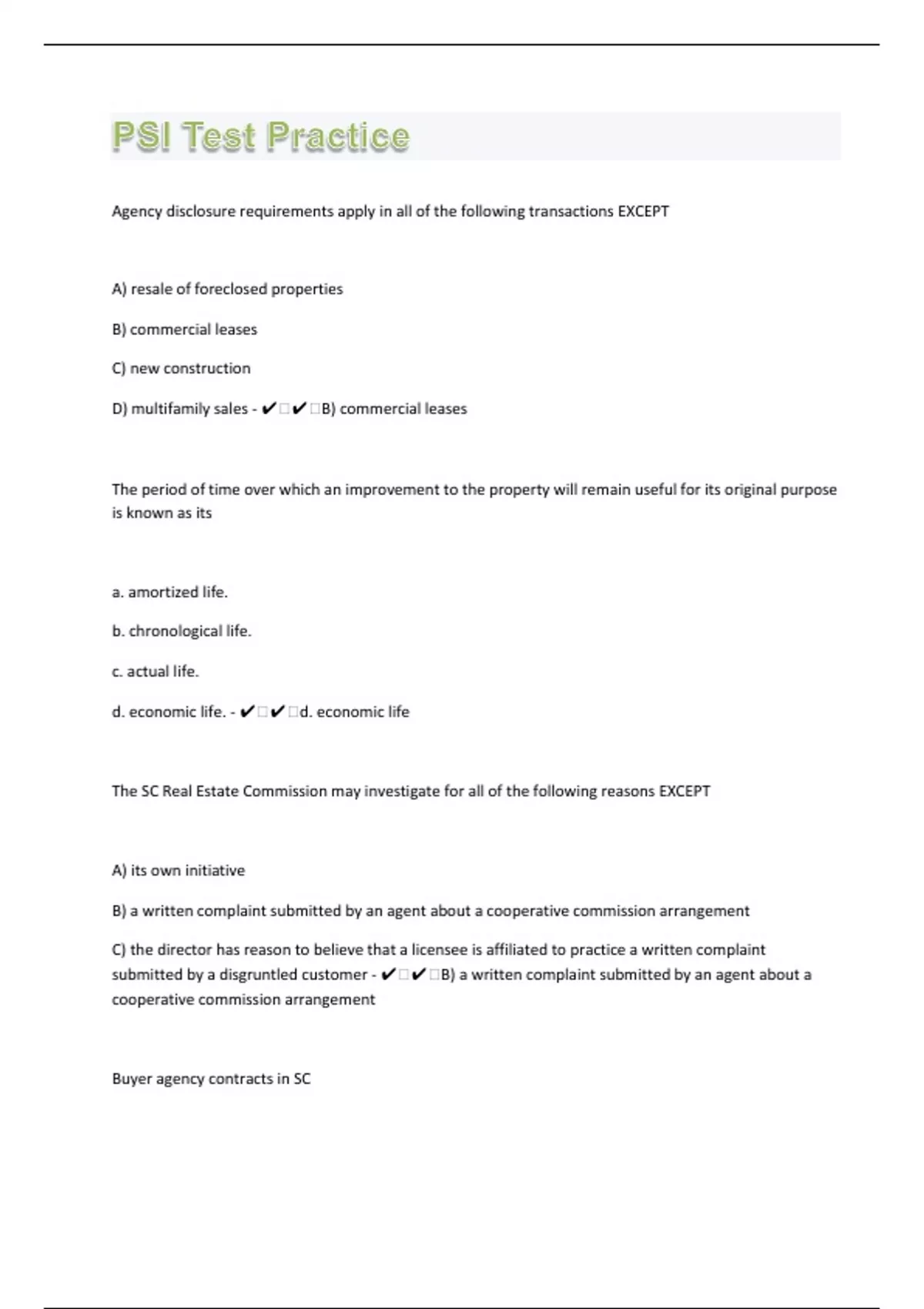 Agency disclosure requirements apply in all of the following transactions EXCEPT A) resale of foreclosed properties B) commercial leases C) new construction D) multifamily sales - ️️B) commercial leases The period of time over which an improvement to the property will remain useful for its original purpose is known as its a. amortized life. b. chronological life. c. actual life. d. economic life. - ️️d. economic life The SC Real Estate Commission may investigate for all of the following reasons EXCEPT A) its own initiative B) a written complaint submitted by an agent about a cooperative commission arrangement C) the director has reason to believe that a licensee is affiliated to practice a written complaint submitted by a disgruntled customer - ️️B) a written complaint submitted by an agent about a cooperative commission arrangement