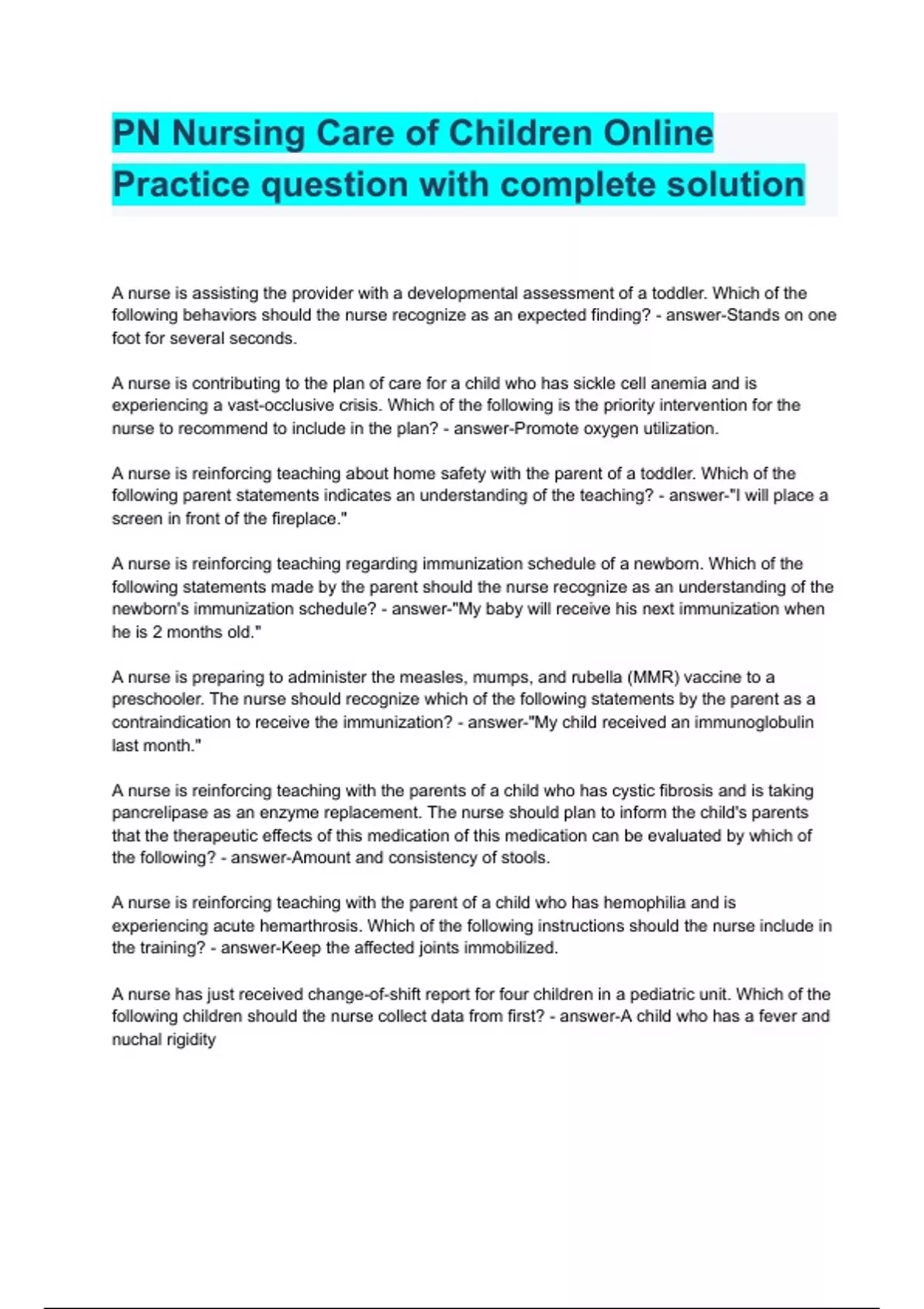 PN Nursing Care of Children Online Practice question with complete solution