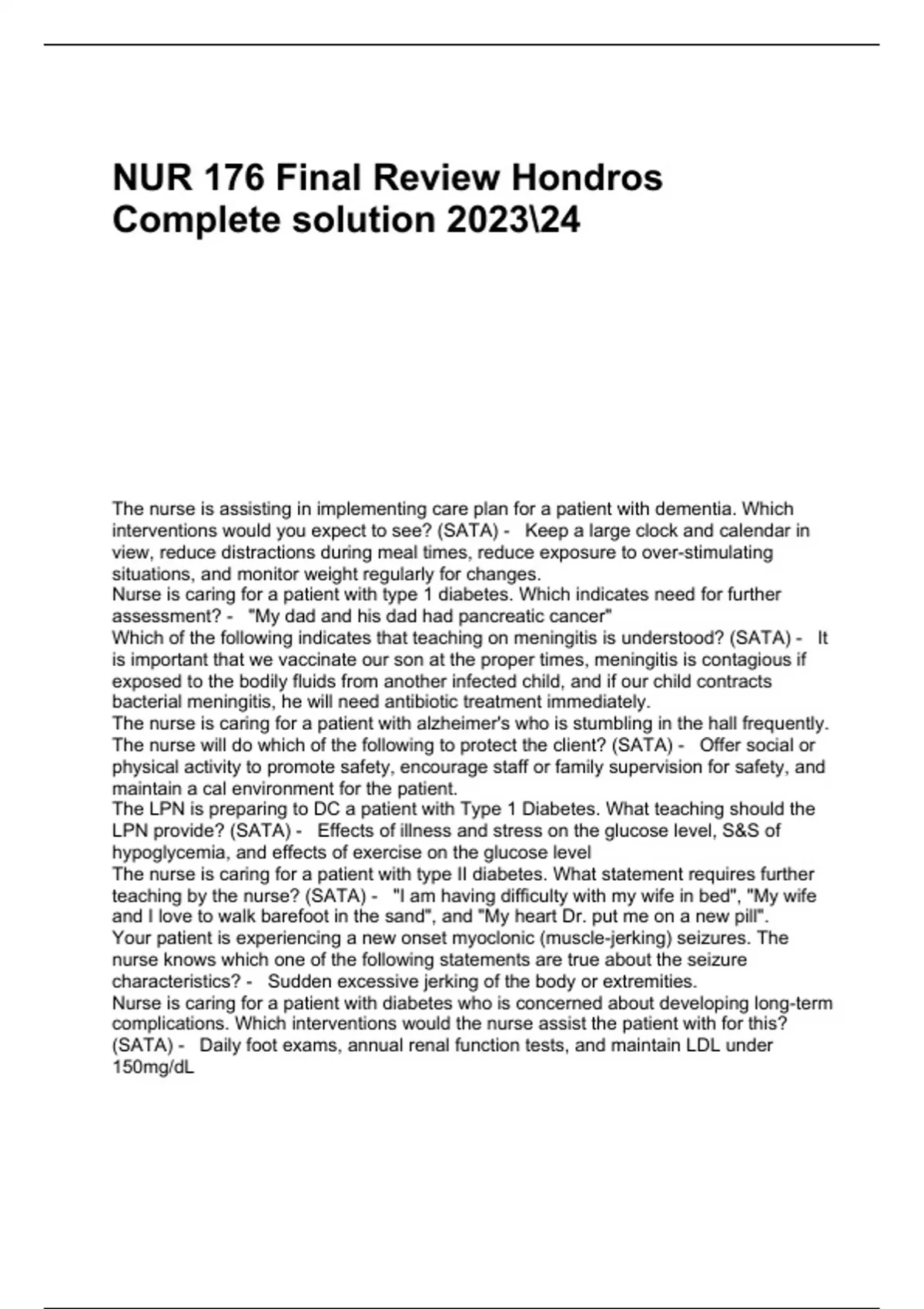 The nurse is assisting in implementing care plan for a patient with dementia. Which interventions would you expect to see? (SATA) - Keep a large clock and calendar in view, reduce distractions during meal times, reduce exposure to over-stimulating situations, and monitor weight regularly for changes. Nurse is caring for a patient with type 1 diabetes. Which indicates need for further assessment? - "My dad and his dad had pancreatic cancer" Which of the following indicates that teaching on meningitis is understood? (SATA) - It is important that we vaccinate our son at the proper times, meningitis is contagious if exposed to the bodily fluids from another infected child, and if our child contracts bacterial meningitis, he will need antibiotic treatment immediately. The nurse is caring for a patient with alzheimer's who is stumbling in the hall frequently. The nurse will do which of the following to protect the client? (SATA) - Offer social or physical activity to promote safety, encourage staff or family supervision for safety, and maintain a cal environment for the patient. The LPN is preparing to DC a patient with Type 1 Diabetes. What teaching should the LPN provide? (SATA) - Effects of illness and stress on the glucose level, S&S of hypoglycemia, and effects of exercise on the glucose level The nurse is caring for a patient with type II diabetes. What statement requires further teaching by the nurse? (SATA) - "I am having difficulty with my wife in bed", "My wife and I love to walk barefoot in the sand", and "My heart Dr. put me on a new pill". Your patient is experiencing a new onset myoclonic (muscle-jerking) seizures. The nurse knows which one of the following statements are true about the seizure characteristics? - Sudden excessive jerking of the body or extremities. Nurse is caring for a patient with diabetes who is concerned about developing long-term complications. Which interventions would the nurse assist the patient with for this? (SATA) - Daily foot exams, annual renal function tests, and maintain LDL under 150mg/dL The nurse is caring for a patient with type II Diabetes. Which statement would indicate a need for further assessment by the nurse? (SATA) - I mix my glargine insulin with my Humalog, I am on prednisone for poison ivy, and I have dry skin on my heel that keeps cracking. Patient in ER with symptoms of a stroke. The nurse knows prompt medication attention is needed within 3 hours to reduce permanent disability or death. Which interventions would nurse anticipate for patient? (SATA) - Administering tissue plasminogen activator (TPA), CT scan or MRI to rule out hemorrhagic stroke, Neuro assessment using NIH stroke scale, and Review any history of bleeding disorders. The nurse is caring for a patient with type I Diabetes post-op 1 day after a right hip replacement.. What should be monitored for this patient? (SATA) - Microalbuminuria, BUN/Creatinine, Blood pressure, and CBC Nurse is caring for patient recently dx with seizures and prescribed phenytoin (Dilantin). What education should we include? (SATA) - Patient should avoid alcohol when taking seizure meds, patient should be encouraged to do good oral hygiene, explain the need to continue medication even when seizures stop, explain that the patient may have driving restrictions. When assessing for meningitis or encephalitis, the nurse is aware which of the following statements is true? - Determining organism specific cause of the condition The nurse is providing dietary teaching to a newly dx diabetic patient. What should be included in education? (SATA) - Plan meals the same time every day, reduce saturated fat and increase exercise, select food from myplate food planning tool. Client is showing signs of dementia. The nurse will practice which guidelines for reality orientation? (SATA) - Set routine and be consistent, be truthful in your responses, and engage them in simple tasks that have a purpose. Patient with new dx of seizures, nurse will instruct patient to keep a log of which of the following? (SATA) - Time and duration of seizures, degree of drowsiness after seizures, and any side effects of nausea and emesis. Nurse caring for patient with suspected early dementia. What S&S will the nurse assess the patient for? (SATA) - Gradual onset of memory loss, difficulty focusing attention, and difficulty finding the right words. Nurse caring for patient with Type II diabetes, reports feeling jittery, racing heart, and sweating even when it's cold. What should nurse do? - Check finger stick blood sugar Patient received 20 units of Novalog sub-q at 0800. What time should the nurse assess for hypoglycemic reaction? - 1000 Nurse caring for patient with elevated ICP recently dx with a brain tumor. Using Tanner's model, which question should the nurse ask? - Have you experienced any vision changes? Patient receives 25 units of Lantus at 2100. What time would the LPN expect to see it start working? - 2200 Nurse finds a dementia patient on the floor and blood on the corner of the dresser. Which would the nurse implement first? - Schedule the patient for a CT of the head. LPN caring for patient who had a stroke 5 days ago. Pt. is nonverbal and does not appear to have understanding of instructions given. What will nurse suspect? - Aphasia