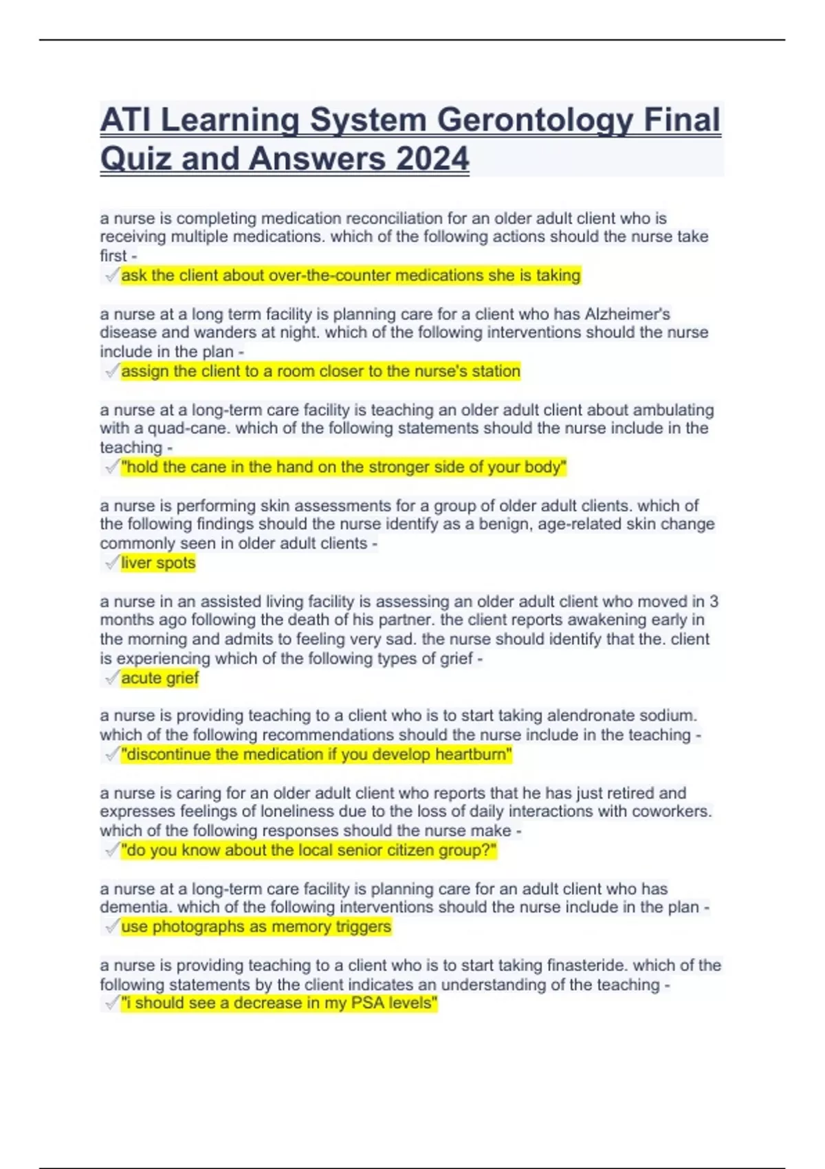 ATI Learning System Gerontology Final Quiz and Answers 2024.