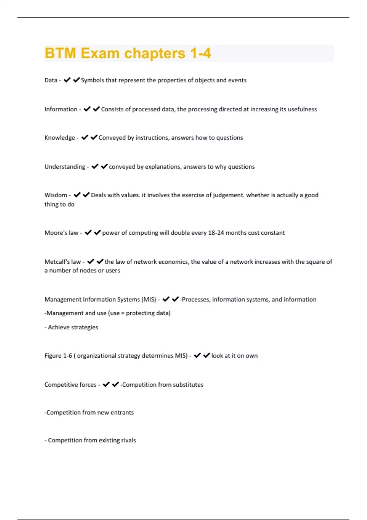 Data - Symbols that represent the properties of objects and events Information - Consists of processed data, the processing directed at increasing its usefulness Knowledge - Conveyed by instructions, answers how to questions Understanding - conveyed by explanations, answers to why questions Wisdom - Deals with values. it involves the exercise of judgement. whether is actually a good thing to do Moore's law - power of computing will double every 18-24 months cost constant Metcalf's law - the law of network economics, the value of a network increases with the square of a number of nodes or users Management Information Systems (MIS) - -Processes, information systems, and information -Management and use (use = protecting data) - Achieve strategies Figure 1-6 ( organizational strategy determines MIS) - look at it on own Competitive forces - -Competition from substitutes -Competition from new entrants - Competition from existing rivalsBargaining Power Forces - - Bargaining power of suppliers - Bargaining power of customers Value Chain - the network of value creating activities Primary activities - - Inbound Logistics: Receiving, storing, and disseminating inputs to products - Operations /manufacturing: Transforming inputs into final products - Outbound logistics: Collecting, storing, and physically distributing products to buyers - Sales and marketing: Inducing buyers to purchase products and providing a means for them to do so - Customer service: Assisting customers' use of products and thus maintaining and enhancing the products' values support activities - - Procurement: involves the selection of vendors and negotiations surrounding purchasing activities - Technology: research and development - human resources: includes activites such as recruiting, compensations, and the training of employees - firm infrastructure: includes general management, finance, accounting, legal, and government affairs Value chain linkages - Interactions across value chain activitiesBusiness Process model and Notation (BPMN) - global standard for documentation (figure 2-2)