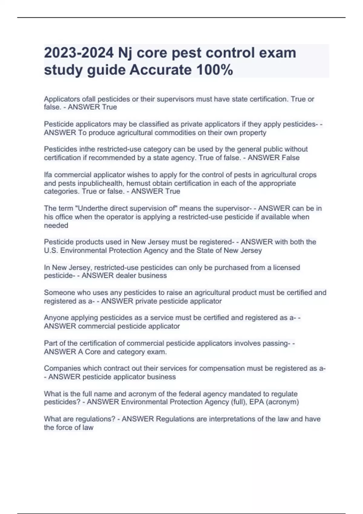 Applicators ofall pesticides or their supervisors must have state certification. True or false. - ANSWER True Pesticide applicators may be classified as private applicators if they apply pesticides- - ANSWER To produce agricultural commodities on their own property Pesticides inthe restricted-use category can be used by the general public without certification if recommended by a state agency. True of false. - ANSWER False Ifa commercial applicator wishes to apply for the control of pests in agricultural crops and pests inpublichealth, hemust obtain certification in each of the appropriate categories. True or false. - ANSWER True The term "Underthe direct supervision of" means the supervisor- - ANSWER can be in his office when the operator is applying a restricted-use pesticide if available when needed Pesticide products used in New Jersey must be registered- - ANSWER with both the U.S. Environmental Protection Agency and the State of New Jersey In New Jersey, restricted-use pesticides can only be purchased from a licensed pesticide- - ANSWER dealer business Someone who uses any pesticides to raise an agricultural product must be certified and registered as a- - ANSWER private pesticide applicator Anyone applying pesticides as a service must be certified and registered as a- - ANSWER commercial pesticide applicator Part of the certification of commercial pesticide applicators involves passing- - ANSWER A Core and category exam.