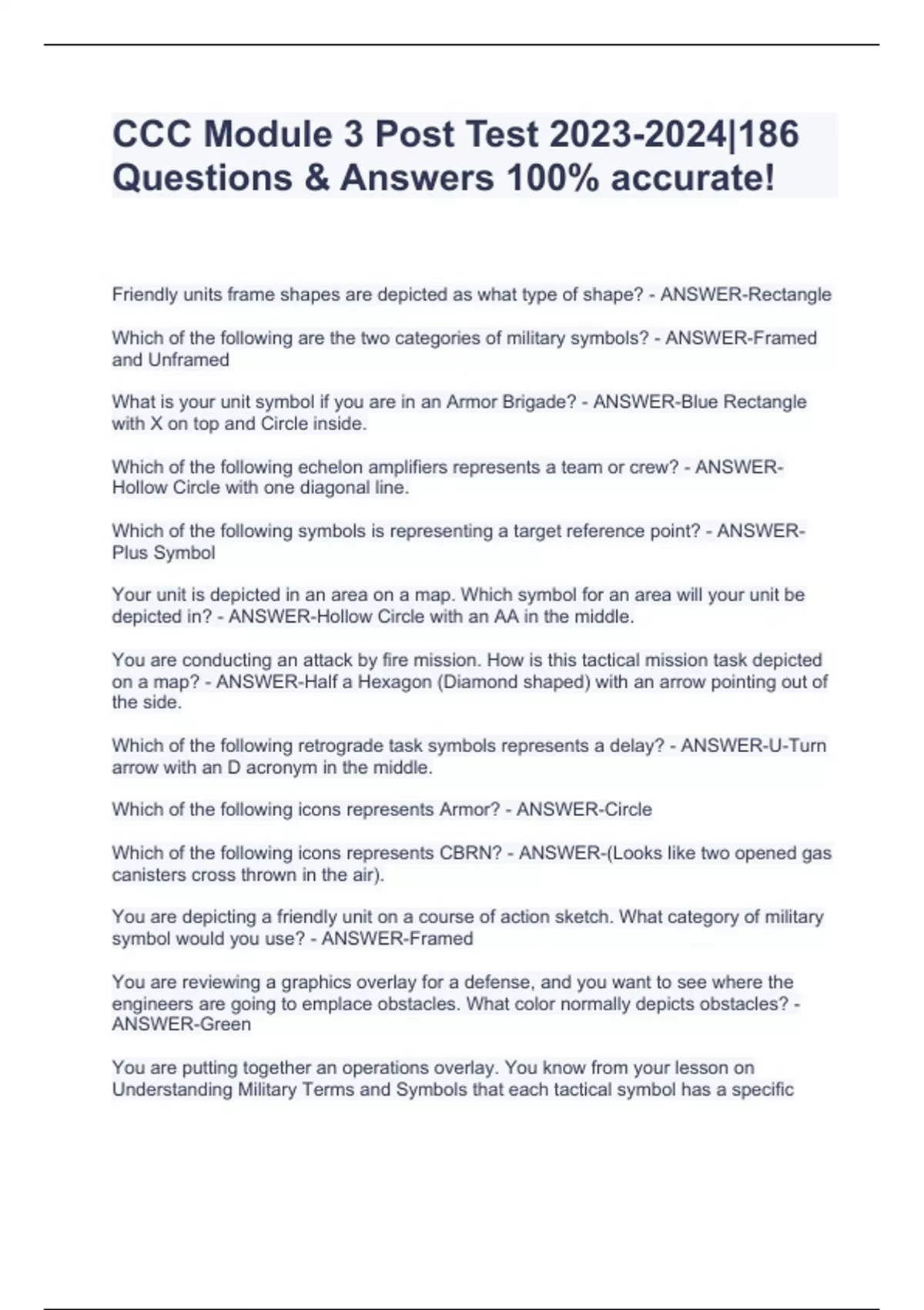 CCC Module 3 Post Test |186 Questions & Answers 100% accurate!Friendly units frame shapes are depicted as what type of shape? - ANSWER-Rectangle Which of the following are the two categories of military symbols? - ANSWER-Framed and Unframed What is your unit symbol if you are in an Armor Brigade? - ANSWER-Blue Rectangle with X on top and Circle inside. Which of the following echelon amplifiers represents a team or crew? - ANSWER-Hollow Circle with one diagonal line. Which of the following symbols is representing a target reference point? - ANSWER-Plus Symbol Your unit is depicted in an area on a map. Which symbol for an area will your unit be depicted in? - ANSWER-Hollow Circle with an AA in the middle. You are conducting an attack by fire mission. How is this tactical mission task depicted on a map? - ANSWER-Half a Hexagon (Diamond shaped) with an arrow pointing out of the side. Which of the following retrograde task symbols represents a delay? - ANSWER-U-Turn arrow with an D acronym in the middle. Which of the following icons represents Armor? - ANSWER-Circle Which of the following icons represents CBRN? - ANSWER-(Looks like two opened gas canisters cross thrown in the air). You are depicting a friendly unit on a course of action sketch. What category of military symbol would you use? - ANSWER-Framed You are reviewing a graphics overlay for a defense, and you want to see where the engineers are going to emplace obstacles. What color normally depicts obstacles? - ANSWER-Green You are putting together an operations overlay. You know from your lesson on Understanding Military Terms and Symbols that each tactical symbol has a specific