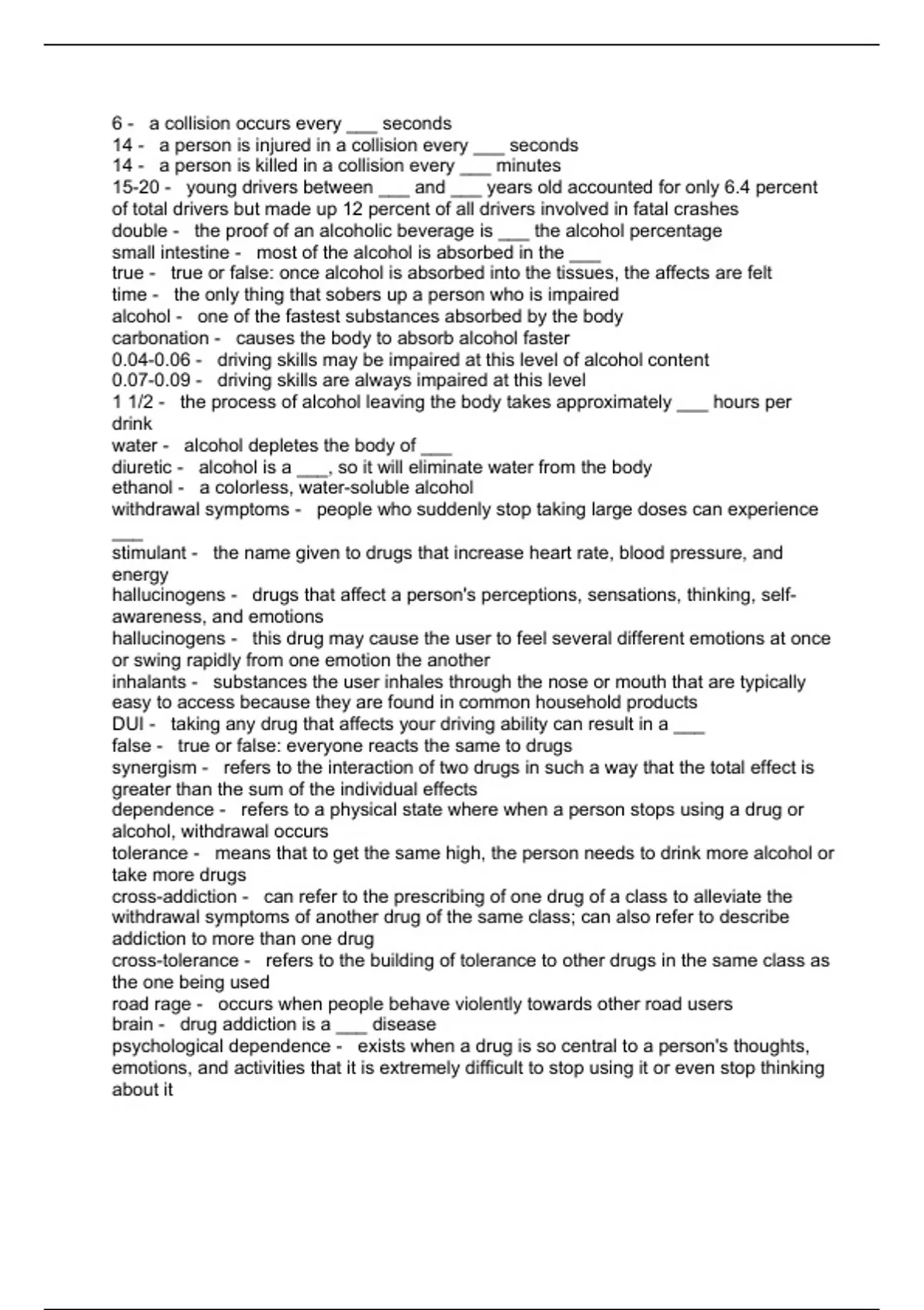 6 - a collision occurs every ___ seconds 14 - a person is injured in a collision every ___ seconds 14 - a person is killed in a collision every ___ minutes 15-20 - young drivers between ___ and ___ years old accounted for only 6.4 percent of total drivers but made up 12 percent of all drivers involved in fatal crashes double - the proof of an alcoholic beverage is ___ the alcohol percentage small intestine - most of the alcohol is absorbed in the ___ true - true or false: once alcohol is absorbed into the tissues, the affects are felt time - the only thing that sobers up a person who is impaired alcohol - one of the fastest substances absorbed by the body carbonation - causes the body to absorb alcohol faster 0.04-0.06 - driving skills may be impaired at this level of alcohol content 0.07-0.09 - driving skills are always impaired at this level 1 1/2 - the process of alcohol leaving the body takes approximately ___ hours per drink water - alcohol depletes the body of ___ diuretic - alcohol is a ___, so it will eliminate water from the body ethanol - a colorless, water-soluble alcohol withdrawal symptoms - people who suddenly stop taking large doses can experience ___ stimulant - the name given to drugs that increase heart rate, blood pressure, and energy hallucinogens - drugs that affect a person's perceptions, sensations, thinking, self-awareness, and emotions hallucinogens - this drug may cause the user to feel several different emotions at once or swing rapidly from one emotion the another inhalants - substances the user inhales through the nose or mouth that are typically easy to access because they are found in common household products DUI - taking any drug that affects your driving ability can result in a ___ false - true or false: everyone reacts the same to drugs synergism - refers to the interaction of two drugs in such a way that the total effect is greater than the sum of the individual effects dependence - refers to a physical state where when a person stops using a drug or alcohol, withdrawal occurs tolerance - means that to get the same high, the person needs to drink more alcohol or take more drugs cross-addiction - can refer to the prescribing of one drug of a class to alleviate the withdrawal symptoms of another drug of the same class; can also refer to describe addiction to more than one drug cross-tolerance - refers to the building of tolerance to other drugs in the same class as the one being used road rage - occurs when people behave violently towards other road users brain - drug addiction is a ___ disease psychological dependence - exists when a drug is so central to a person's thoughts, emotions, and activities that it is extremely difficult to stop using it or even stop thinking about it