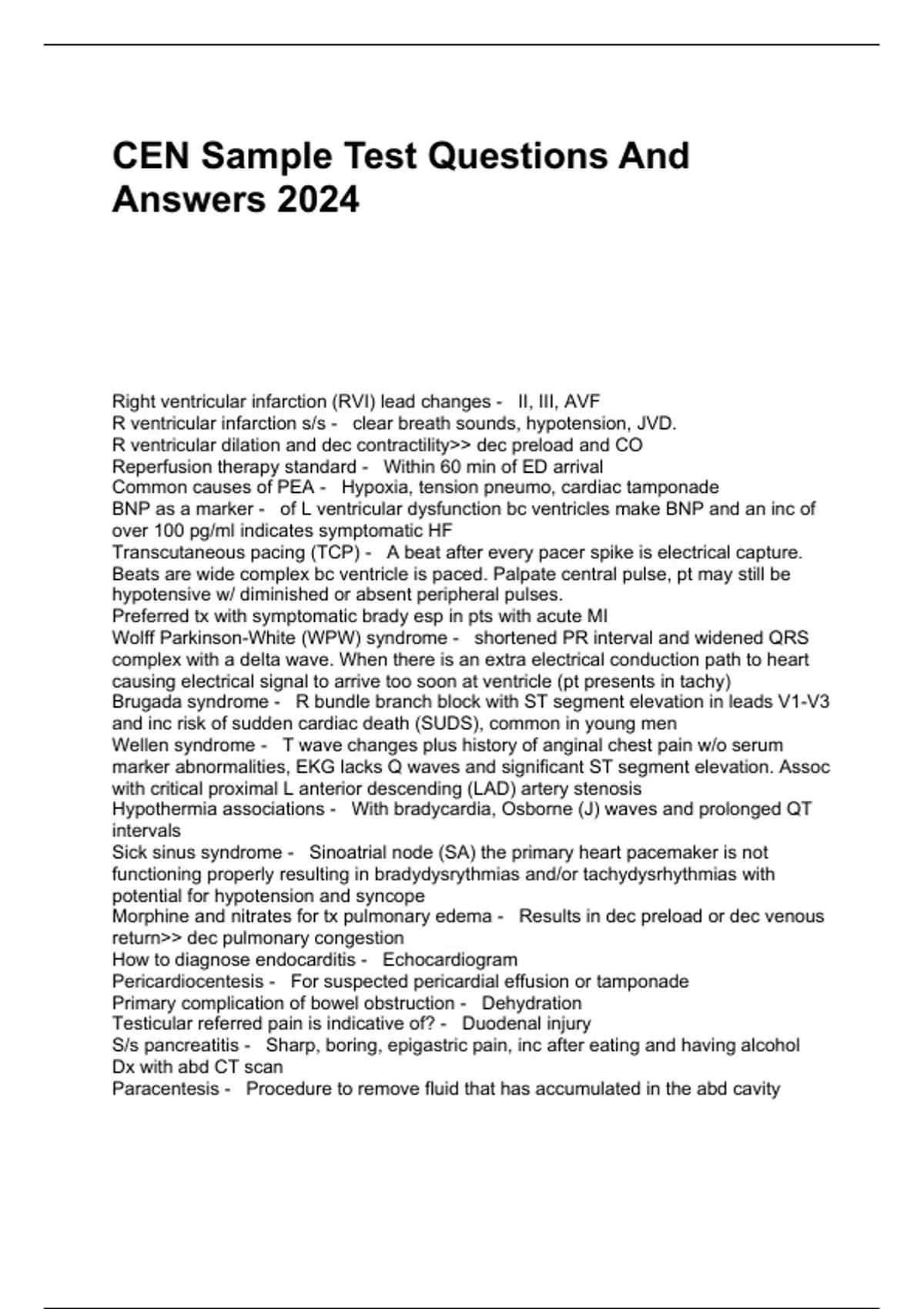 Right ventricular infarction (RVI) lead changes - II, III, AVF R ventricular infarction s/s - clear breath sounds, hypotension, JVD. R ventricular dilation and dec contractility>> dec preload and CO Reperfusion therapy standard - Within 60 min of ED arrival Common causes of PEA - Hypoxia, tension pneumo, cardiac tamponade BNP as a marker - of L ventricular dysfunction bc ventricles make BNP and an inc of over 100 pg/ml indicates symptomatic HF Transcutaneous pacing (TCP) - A beat after every pacer spike is electrical capture. Beats are wide complex bc ventricle is paced. Palpate central pulse, pt may still be hypotensive w/ diminished or absent peripheral pulses. Preferred tx with symptomatic brady esp in pts with acute MI Wolff Parkinson-White (WPW) syndrome - shortened PR interval and widened QRS complex with a delta wave. When there is an extra electrical conduction path to heart causing electrical signal to arrive too soon at ventricle (pt presents in tachy) Brugada syndrome - R bundle branch block with ST segment elevation in leads V1-V3 and inc risk of sudden cardiac death (SUDS), common in young men Wellen syndrome - T wave changes plus history of anginal chest pain w/o serum marker abnormalities, EKG lacks Q waves and significant ST segment elevation. Assoc with critical proximal L anterior descending (LAD) artery stenosis Hypothermia associations - With bradycardia, Osborne (J) waves and prolonged QT intervals Sick sinus syndrome - Sinoatrial node (SA) the primary heart pacemaker is not functioning properly resulting in bradydysrythmias and/or tachydysrhythmias with potential for hypotension and syncope Morphine and nitrates for tx pulmonary edema - Results in dec preload or dec venous return>> dec pulmonary congestion How to diagnose endocarditis - Echocardiogram Pericardiocentesis - For suspected pericardial effusion or tamponade Primary complication of bowel obstruction - Dehydration Testicular referred pain is indicative of? - Duodenal injury S/s pancreatitis - Sharp, boring, epigastric pain, inc after eating and having alcohol Dx with abd CT scan Paracentesis - Procedure to remove fluid that has accumulated in the abd cavity