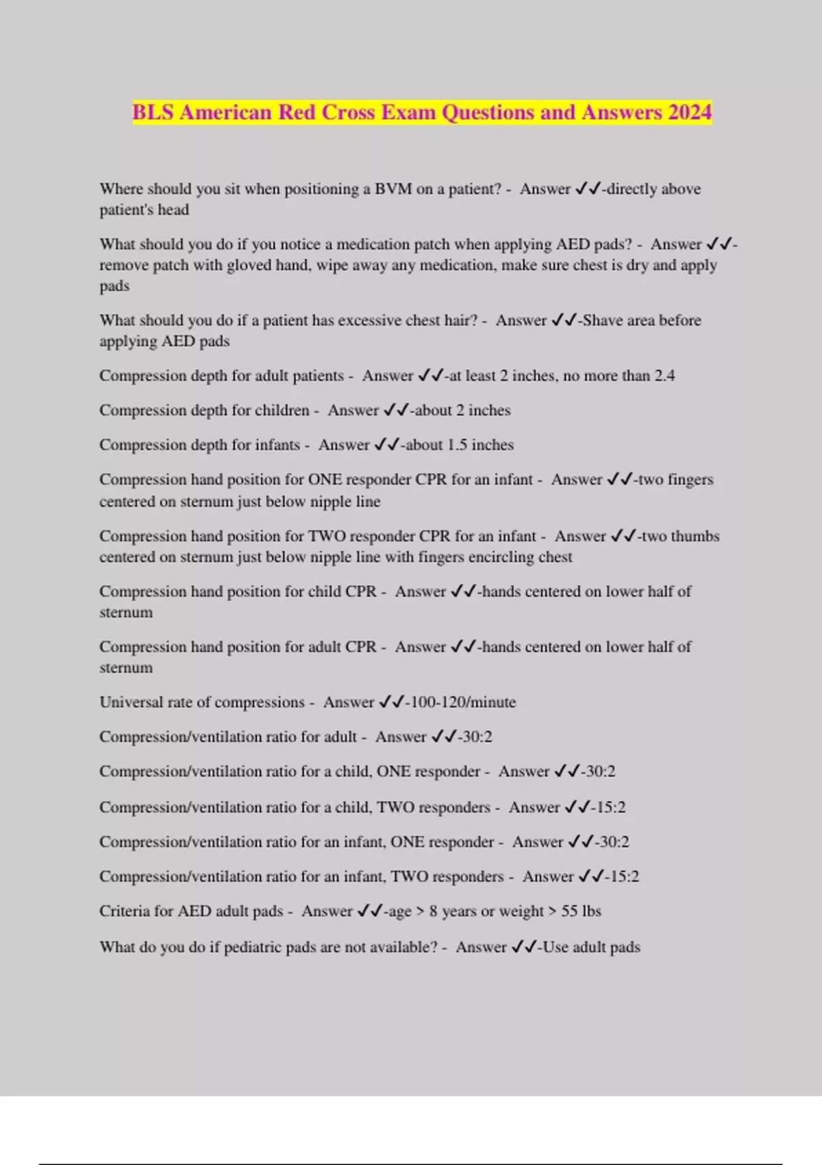 BLS American Red Cross Exam Questions and Answers 2024 Where should you sit when positioning a BVM on a patient? - Answer ️️ -directly above patient's head What should you do if you notice a medication patch when applying AED pads? - Answer ️️ - remove patch with gloved hand, wipe away any medication, make sure chest is dry and apply pads What should you do if a patient has excessive chest hair? - Answer ️️ -Shave area before applying AED pads Compression depth for adult patients - Answer ️️ -at least 2 inches, no more than 2.4 Compression depth for children - Answer ️️ -about 2 inches Compression depth for infants - Answer ️️ -about 1.5 inches Compression hand position for ONE responder CPR for an infant - Answer ️️ -two fingers centered on sternum just below nipple line Compression hand position for TWO responder CPR for an infant - Answer ️️ -two thumbs centered on sternum just below nipple line with fingers encircling chest Compression hand position for child CPR - Answer ️️ -hands centered on lower half of sternum Compression hand position for adult CPR - Answer ️️ -hands centered on lower half of sternum Universal rate of compressions - Answer ️️ -100-120/minute