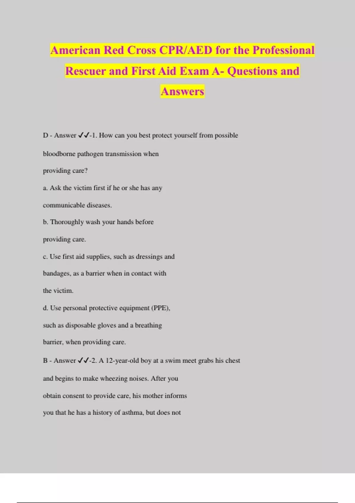 American Red Cross CPR/AED for the Professional Rescuer and First Aid Exam A- Questions and Answers D - Answer ️️ -1. How can you best protect yourself from possible bloodborne pathogen transmission when providing care? a. Ask the victim first if he or she has any communicable diseases. b. Thoroughly wash your hands before providing care. c. Use first aid supplies, such as dressings and bandages, as a barrier when in contact with the victim. d. Use personal protective equipment (PPE), such as disposable gloves and a breathing barrier, when providing care. B - Answer ️️ -2. A 12-year-old boy at a swim meet grabs his chest and begins to make wheezing noises. After you obtain consent to provide care, his mother informs you that he has a history of asthma, but does not