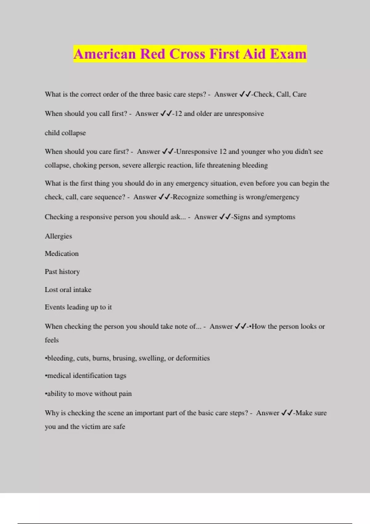 American Red Cross First Aid Exam What is the correct order of the three basic care steps? - Answer ️️ -Check, Call, Care When should you call first? - Answer ️️ -12 and older are unresponsive child collapse When should you care first? - Answer ️️ -Unresponsive 12 and younger who you didn't see collapse, choking person, severe allergic reaction, life threatening bleeding What is the first thing you should do in any emergency situation, even before you can begin the check, call, care sequence? - Answer ️️ -Recognize something is wrong/emergency Checking a responsive person you should ask... - Answer ️️ -Signs and symptoms Allergies Medication Past history Lost oral intake Events leading up to it When checking the person you should take note of... - Answer ️️ -•How the person looks or feels •bleeding, cuts, burns, brusing, swelling, or deformities •medical identification tags •ability to move without pain Why is checking the scene an important part of the basic care steps? - Answer ️️ -Make sure you and the victim are safe
