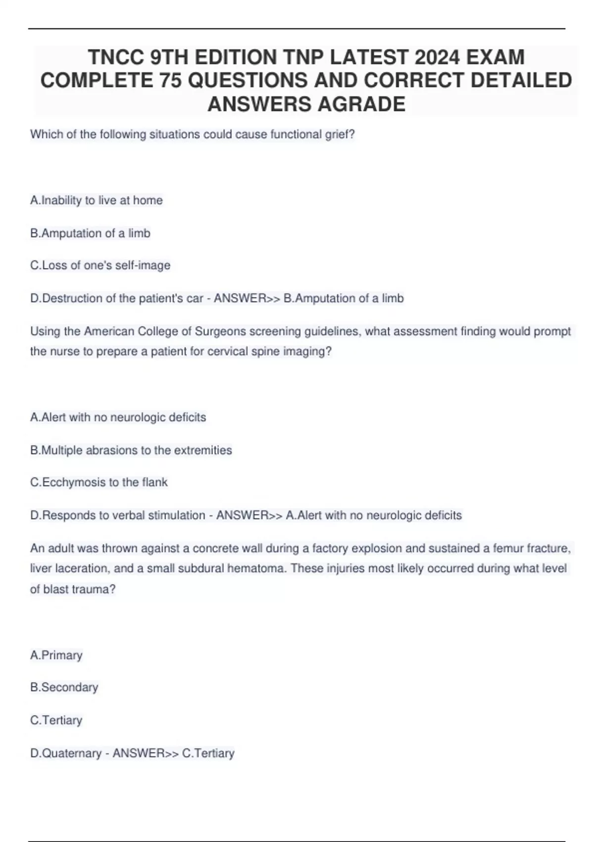 TNCC 9TH EDITION EXAM LATEST 2024 TNP COMPLETE 75 QUESTIONS AND CORRECT DETAILED ANSWERS AGRADE