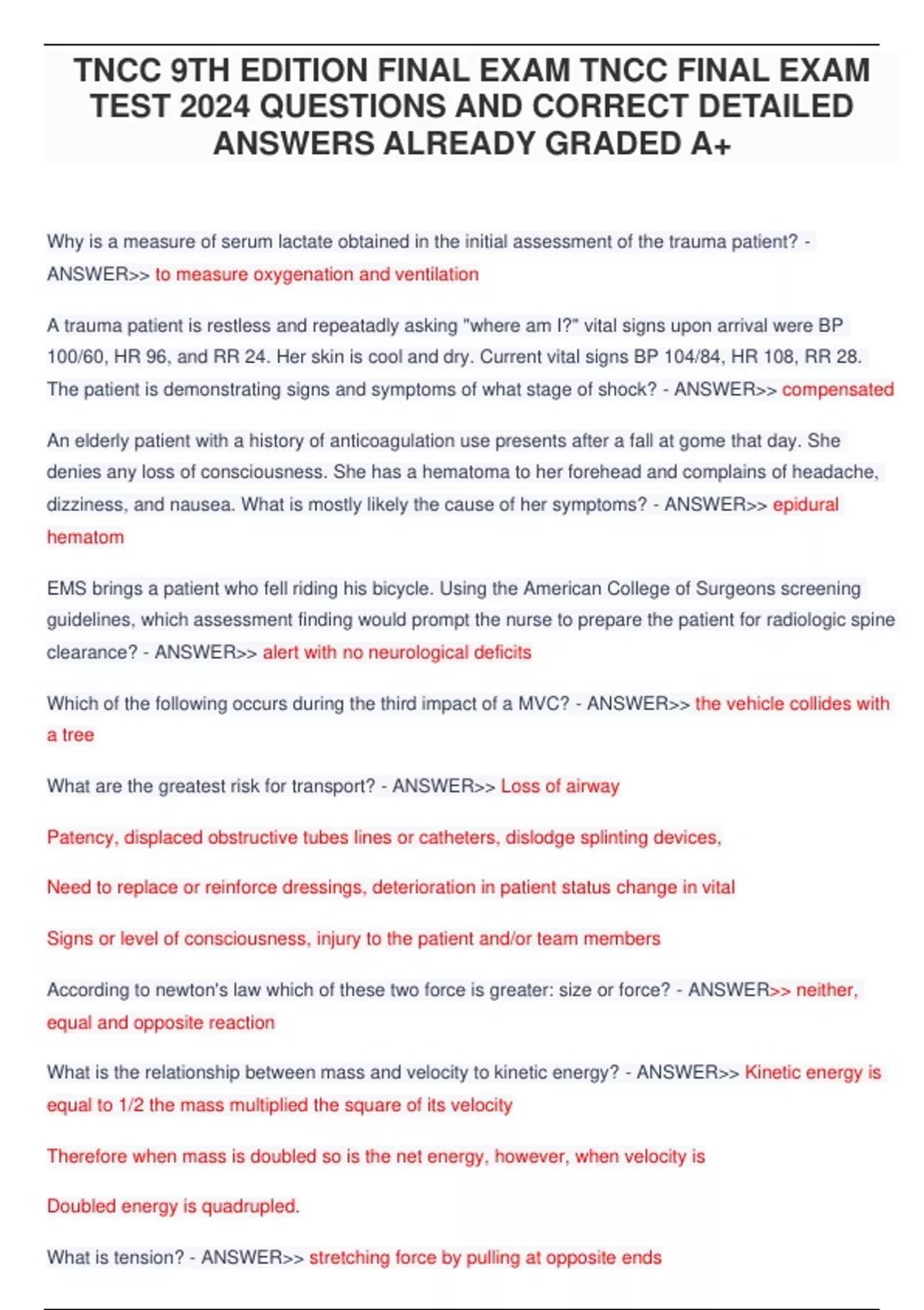 TNCC 9TH EDITION FINAL EXAM TNCC FINAL EXAM TEST 2024 QUESTIONS AND CORRECT DETAILED ANSWERS AGRADE
