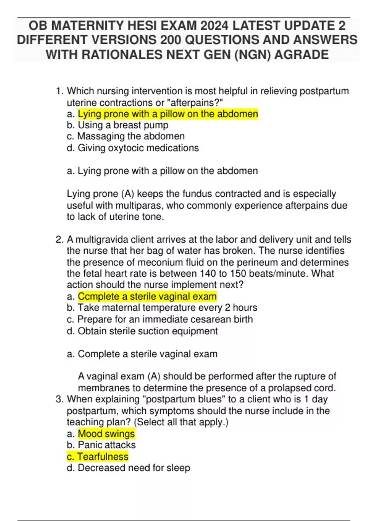 OB MATERNITY HESI EXAM VERSION A, B, C AND PRACTICE