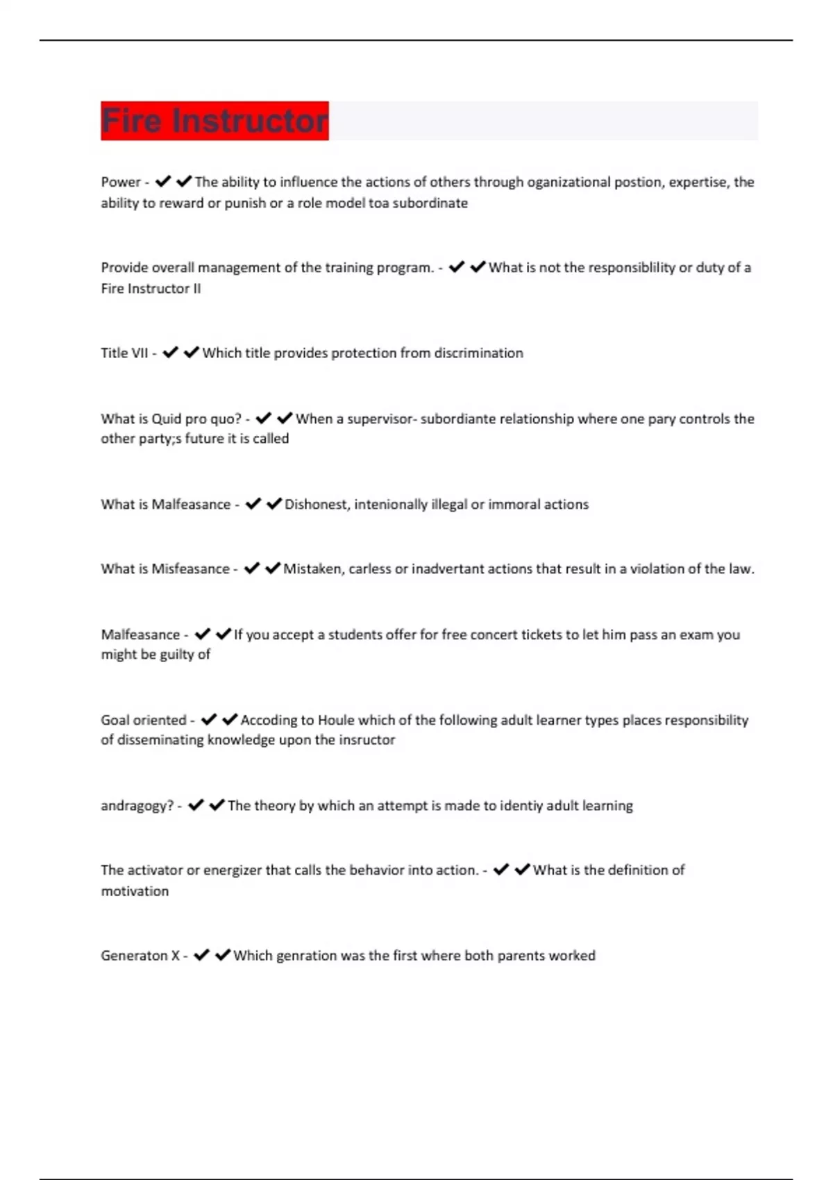 Power - The ability to influence the actions of others through oganizational postion, expertise, the ability to reward or punish or a role model toa subordinate Provide overall management of the training program. - What is not the responsiblility or duty of a Fire Instructor II Title VII - Which title provides protection from discrimination What is Quid pro quo? -When a supervisor- subordiante relationship where one pary controls the other party;s future it is called What is Malfeasance - Dishonest, intenionally illegal or immoral actions What is Misfeasance - Mistaken, carless or inadvertant actions that result in a violation of the law. Malfeasance - If you accept a students offer for free concert tickets to let him pass an exam you might be guilty of Goal oriented - Accoding to Houle which of the following adult learner types places responsibility of disseminating knowledge upon the insructor andragogy? - The theory by which an attempt is made to identiy adult learning The activator or energizer that calls the behavior into action. - What is the definition of motivation Generaton X - Which genration was the first where both parents workedExpect immediate gratification - Which is NOT a trait of Gen Xers? Affective Domain - The domain that affects emotion, atitudes and values Behaviorist perspective - The theory that learing is relatively permanent change in behavior arising from experience Blooms taxonomy - A classification of different objectives and skills that educators set for student ( learning objectives) Cognitive Domain - The domain that effectts a change in knowledge. It is most often associated with learning new information Cognitive perspective - Intellectual process by which experience contributes to relativesly permanent change Dyscalculia - Learning disability in math and related subjects