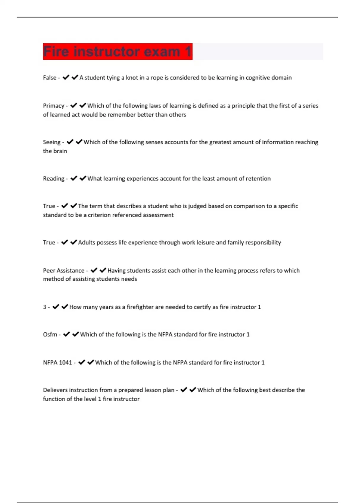 False - A student tying a knot in a rope is considered to be learning in cognitive domain Primacy - Which of the following laws of learning is defined as a principle that the first of a series of learned act would be remember better than others Seeing - Which of the following senses accounts for the greatest amount of information reaching the brain Reading - What learning experiences account for the least amount of retention True - The term that describes a student who is judged based on comparison to a specific standard to be a criterion referenced assessment True - Adults possess life experience through work leisure and family responsibility Peer Assistance - Having students assist each other in the learning process refers to which method of assisting students needs 3 - How many years as a firefighter are needed to certify as fire instructor 1 Osfm - Which of the following is the NFPA standard for fire instructor 1 NFPA 1041 - Which of the following is the NFPA standard for fire instructor 1 Delievers instruction from a prepared lesson plan -Which of the following best describe the function of the level 1 fire instructorMessage feedback - Fill in the blank with the missing elements of communication model sender reciever medium inference True - A low frequency event with high severity and high frequency event with low severity have esstantially the same priority of concern as it relates to risk management Illustrated Lecture - Instructional techique in which audiovisual training aid accompy a lecture to clarify information Case Study - Description of real or hypothetical problem that an organization or an individual dealt with or face in the future.