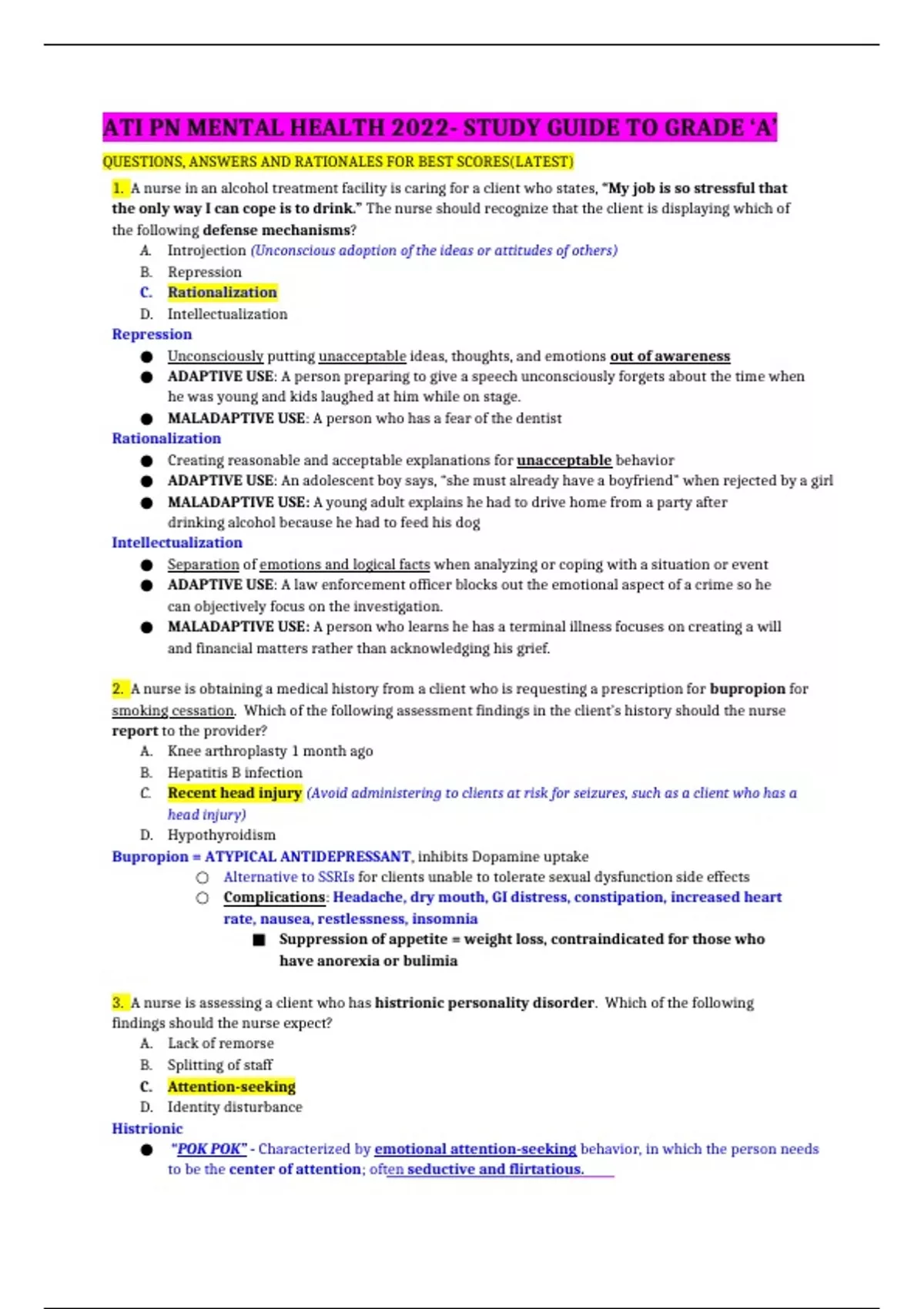 1. A nurse in an alcohol treatment facility is caring for a client who states, “My job is so stressful that the only way I can cope is to drink.” The nurse should recognize that the client is displaying which of the following defense mechanisms? A. Introjection (Unconscious adoption of the ideas or attitudes of others) B. Repression C. Rationalization D. Intellectualization Repression ● Unconsciously putting unacceptable ideas, thoughts, and emotions out of awareness ● ADAPTIVE USE: A person preparing to give a speech unconsciously forgets about the time when he was young and kids laughed at him while on stage. ● MALADAPTIVE USE: A person who has a fear of the dentist Rationalization ● Creating reasonable and acceptable explanations for unacceptable behavior ● ADAPTIVE USE: An adolescent boy says, “she must already have a boyfriend” when rejected by a girl ● MALADAPTIVE USE: A young adult explains he had to drive home from a party after drinking alcohol because he had to feed his dog Intellectualization ● Separation of emotions and logical facts when analyzing or coping with a situation or event ● ADAPTIVE USE: A law enforcement officer blocks out the emotional aspect of a crime so he can objectively focus on the investigation. ● MALADAPTIVE USE: A person who learns he has a terminal illness focuses on creating a will and financial matters rather than acknowledging his grief. 2. A nurse is obtaining a medical history from a client who is requesting a prescription for bupropion for smoking cessation. Which of the following assessment findings in the client’s history should the nurse report to the provider? A. Knee arthroplasty 1 month ago B. Hepatitis B infection C. Recent head injury (Avoid administering to clients at risk for seizures, such as a client who has a head injury) D. Hypothyroidism Bupropion = ATYPICAL ANTIDEPRESSANT, inhibits Dopamine uptake ○ Alternative to SSRIs for clients unable to tolerate sexual dysfunction side effects ○ Complications: Headache, dry mouth, GI distress, constipation, increased heart rate, nausea, restlessness, insomnia ■ Suppression of appetite = weight loss, contraindicated for those who have anorexia or bulimia 3. A nurse is assessing a client who has histrionic personality disorder. Which of the following findings should the nurse expect? A. Lack of remorse B. Splitting of staff C. Attention-seeking D. Identity disturbance Histrionic ● “POK POK” - Characterized by emotional attention-seeking behavior, in which the person needs to be the center of attention; often seductive and flirtatious. 4. A nurse is providing teaching to the daughter of an older client who has obsessive-compulsive disorder. Which of the following statements by the daughter indicates an understanding of the teaching? A. “I will provide my mother with detailed instructions about how to perform self-care.” (Give simple directions) B. “I will limit my mother’s clothing choices when she is getting dressed.” (If client is indecisive, limit the client's choices; if client still unable to make a decision, give client one outfit to wear) C. “I will wake my mother up a couple of times in the night to check on her.” D. “I will discourage my mother from talking about her physical complaints.” OCD ● The client attempts to suppress persistent thoughts or urges that cause anxiety through compulsive or obsessive behaviors, such as repetitive hand washing. ● Obsessions or compulsions are time-consuming and result in impaired social and occupational functioning. 5.A nurse is providing crisis intervention for a client who was involved in a violent mass casualty situation in the community. Which of the following actions should the nurse take during the initial session with the client? A. Identify the client’s usual coping style. B. Encourage the client to display anger toward the cause of the crisis. (Reduce stress-related manifestations, such as using techniques to alleviate a panic attack) C. Tell the client that this life will soon return to normal (False assurance) D. Help the client focus on a wide variety of topics regarding the crisis. (Reduce stress) 6.A charge nurse is orienting a newly licensed nurse and observes the newly licensed nurse imitating her behaviors. The nurse should recognize this behavior as which of the following defense mechanisms? A. Suppression (Voluntarily denying unpleasant thoughts and feelings) B. Identification (Conscious or unconscious assumption of the characteristics of another individual or group) C. Compensation (Emphasizing strengths to make up for weaknesses) D. Reaction formation (Overcompensating or demonstrating the opposite behavior of what is felt) 7.A nurse in an inpatient mental health facility is assessing a client who has schizophrenia and is taking haloperidol. Which of the following clinical findings is the nurse’s priority? A. Insomnia (Sedation) B. Urinary frequency (Complication → ANTIcholinergic effects) C. High fever (Complication → agranulocytosis) D. Headache Other complications: Acute dystonia, Pseudoparkinsonism, Akathisia, Tardive dyskinesia, Neuroendocrine effects (Gynecomastia, Weight gain, Menstrual irregularities), NMS, Orthostatic Hypotension, Sedation, Sexual dysfunction, Skin effects, Liver impairment 8.A nurse in a mental health facility is caring for a client. Which of the following actions should the nurse take during the working phase of the nurse-client relationship? A. Summarize goals and objectives. B. Address confidentiality. C. Promote problem-solving skills. D. Establish a participation contract 9.A nurse is providing behavioral therapy for a client who has OCD. The client repeatedly checks that the doors are locked at night. Which of the following instructions should the nurse give the client when using thought stopping technique? A. “Keep a journal of how often you check the locks each night.” B. “Ask a family member to check the locks for you a