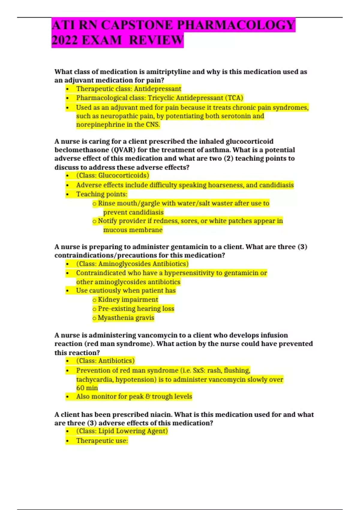 What class of medication is amitriptyline and why is this medication used as an adjuvant medication for pain? • Therapeutic class: Antidepressant • Pharmacological class: Tricyclic Antidepressant (TCA) • Used as an adjuvant med for pain because it treats chronic pain syndromes, such as neuropathic pain, by potentiating both serotonin and norepinephrine in the CNS. A nurse is caring for a client prescribed the inhaled glucocorticoid beclomethasone (QVAR) for the treatment of asthma. What is a potential adverse effect of this medication and what are two (2) teaching points to discuss to address these adverse effects? • (Class: Glucocorticoids) • Adverse effects include difficulty speaking hoarseness, and candidiasis • Teaching points: o Rinse mouth/gargle with water/salt waster after use to prevent candidiasis o Notify provider if redness, sores, or white patches appear in mucous membrane A nurse is preparing to administer gentamicin to a client. What are three (3) contraindications/precautions for this medication? • (Class: Aminoglycosides Antibiotics) • Contraindicated who have a hypersensitivity to gentamicin or other aminoglycosides antibiotics • Use cautiously when patient has o Kidney impairment o Pre-existing hearing loss o Myasthenia gravis A nurse is administering vancomycin to a client who develops infusion reaction (red man syndrome). What action by the nurse could have prevented this reaction? • (Class: Antibiotics) • Prevention of red man syndrome (i.e. SxS: rash, flushing, tachycardia, hypotension) is to administer vancomycin slowly over 60 min • Also monitor for peak & trough levels A client has been prescribed niacin. What is this medication used for and what are three (3) adverse effects of this medication? • (Class: Lipid Lowering Agent) • Therapeutic use: o Decrease LDL cholesterol & triglyceride levels o Also used an adjuvant in certain hyperlipidemias • Adverse effects include o GI distress o Facial flushing (Feeling of warmth, tingling of hands & feet), Hyperglycemia o Hepatotoxicity o Hyperuricemia A client has been prescribed intranasal calcitonin (Miacalcin) for the treatment of osteoporosis. What client education should be provided by the nurse to prevent nasal dryness and irritation? • (Class: Hypocalcemic Hormone)-CALCITONIN SALMON-Manmade hormone that occurs naturally in the thyroid gland used to treat Paget’s disease of the bone ,postmenopausal osteoporosis an hypercalcemia • Prevention of nasal dryness & irritation includes: o Alternate nostrils daily o Inspect nasal mucosa periodically for ulcerations o Use the medication at the lowest effective dosage for the shortest duration possible. ..............................................................................................CONTINUE.