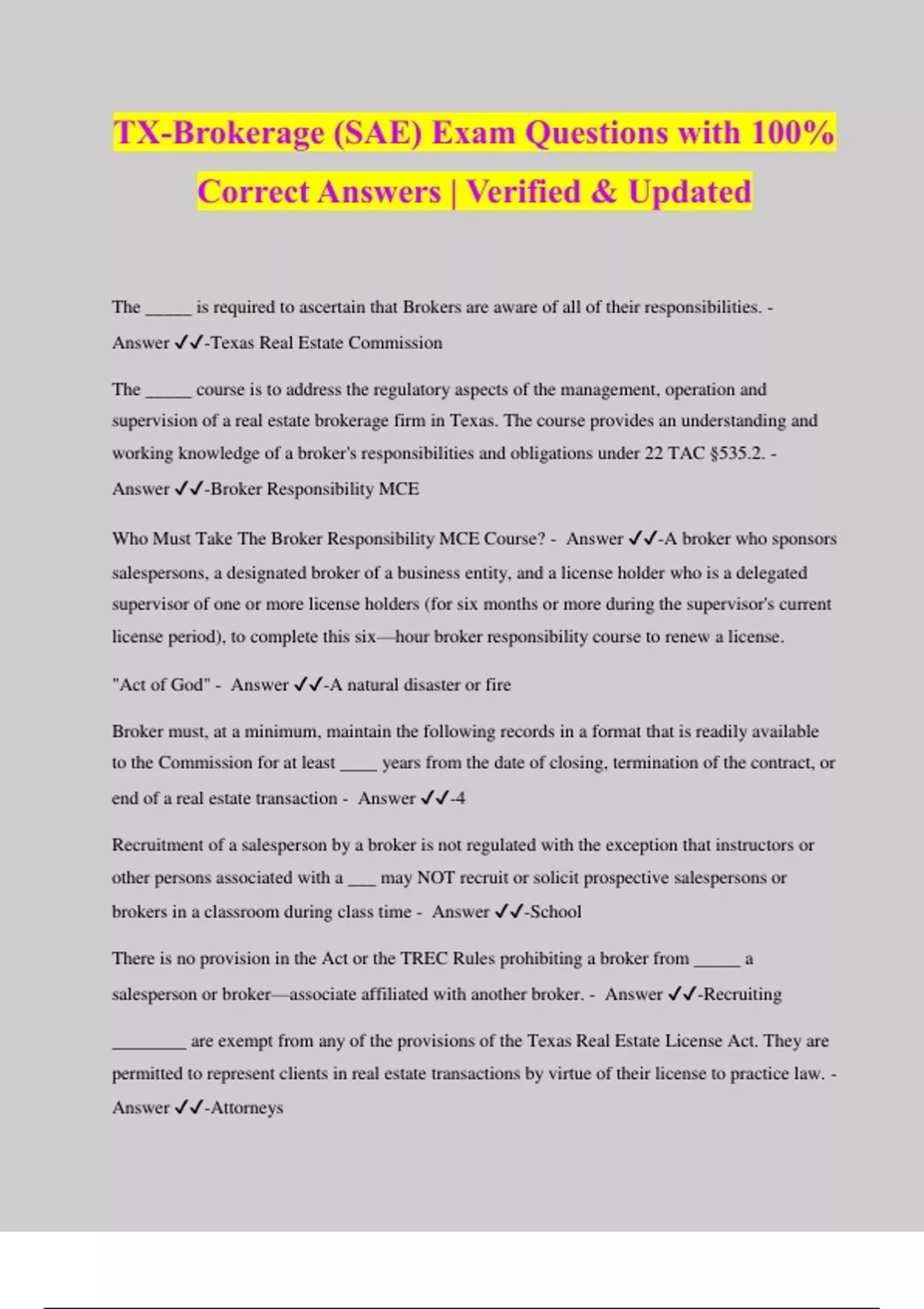 TX-Brokerage (SAE) Exam Questions with 100% Correct Answers | Verified & Updated The _____ is required to ascertain that Brokers are aware of all of their responsibilities. - Answer ️️ -Texas Real Estate Commission The _____ course is to address the regulatory aspects of the management, operation and supervision of a real estate brokerage firm in Texas. The course provides an understanding and working knowledge of a broker's responsibilities and obligations under 22 TAC §535.2. - Answer ️️ -Broker Responsibility MCE Who Must Take The Broker Responsibility MCE Course? - Answer ️️ -A broker who sponsors salespersons, a designated broker of a business entity, and a license holder who is a delegated supervisor of one or more license holders (for six months or more during the supervisor's current license period), to complete this six—hour broker responsibility course to renew a license. "Act of God" - Answer ️️ -A natural disaster or fire Broker must, at a minimum, maintain the following records in a format that is readily available to the Commission for at least ____ years from the date of closing, termination of the contract, or end of a real estate transaction - Answer ️️ -4 Recruitment of a salesperson by a broker is not regulated with the exception that instructors or other persons associated with a ___ may NOT recruit or solicit prospective salespersons or brokers in a classroom during class time - Answer ️️ -School There is no provision in the Act or the TREC Rules prohibiting a broker from _____ a salesperson or broker—associate affiliated with another broker. - Answer ️️ -Recruiting ________ are exempt from any of the provisions of the Texas Real Estate License Act. They are permitted to represent clients in real estate transactions by virtue of their license to practice law. - Answer ️️ -Attorneys