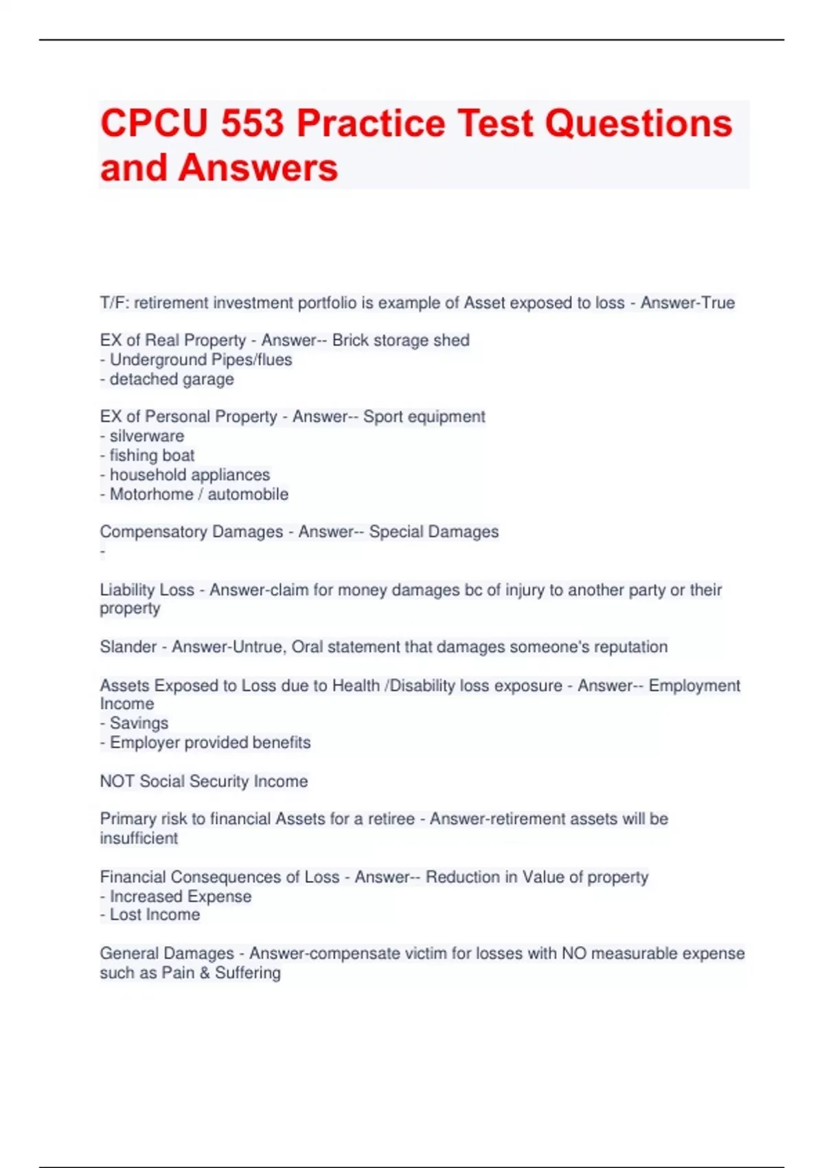 CPCU 553 Practice Test Questions and Answers T/F: retirement investment portfolio is example of Asset exposed to loss - Answer-True EX of Real Property - Answer-- Brick storage shed - Underground Pipes/flues - detached garage EX of Personal Property - Answer-- Sport equipment - silverware - fishing boat - household appliances - Motorhome / automobile Compensatory Damages - Answer-- Special Damages - Liability Loss - Answer-claim for money damages bc of injury to another party or their property Slander - Answer-Untrue, Oral statement that damages someone's reputation Assets Exposed to Loss due to Health /Disability loss exposure - Answer-- Employment Income - Savings - Employer provided benefits NOT Social Security Income Primary risk to financial Assets for a retiree - Answer-retirement assets will be insufficient Financial Consequences of Loss - Answer-- Reduction in Value of property - Increased Expense - Lost Income General Damages - Answer-compensate victim for losses with NO measurable expense such as Pain & Suffering