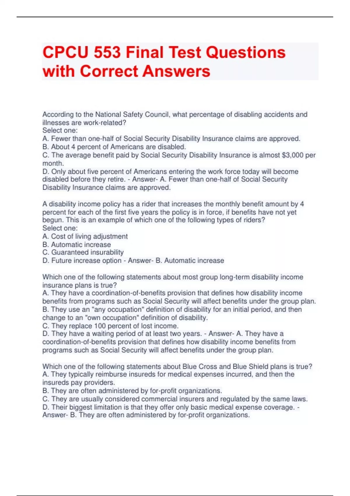 CPCU 553 Final Test Questions with Correct Answers According to the National Safety Council, what percentage of disabling accidents and illnesses are work-related? Select one: A. Fewer than one-half of Social Security Disability Insurance claims are approved. B. About 4 percent of Americans are disabled. C. The average benefit paid by Social Security Disability Insurance is almost $3,000 per month. D. Only about five percent of Americans entering the work force today will become disabled before they retire. - Answer- A. Fewer than one-half of Social Security Disability Insurance claims are approved. A disability income policy has a rider that increases the monthly benefit amount by 4 percent for each of the first five years the policy is in force, if benefits have not yet begun. This is an example of which one of the following types of riders? Select one: A. Cost of living adjustment B. Automatic increase C. Guaranteed insurability D. Future increase option - Answer- B. Automatic increase Which one of the following statements about most group long-term disability income insurance plans is true? A. They have a coordination-of-benefits provision that defines how disability income benefits from programs such as Social Security will affect benefits under the group plan. B. They use an "any occupation" definition of disability for an initial period, and then change to an "own occupation" definition of disability. C. They replace 100 percent of lost income. D. They have a waiting period of at least two years. - Answer- A. They have a coordination-of-benefits provision that defines how disability income benefits from programs such as Social Security will affect benefits under the group plan.