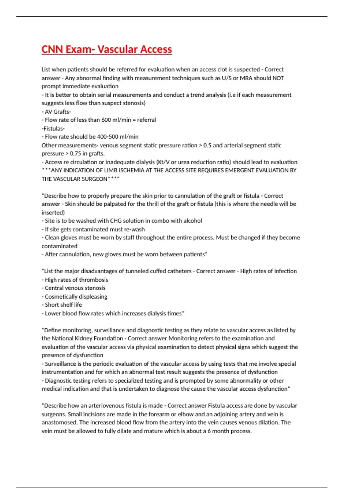 CNN Exam- Vascular Access questions with verified answers.