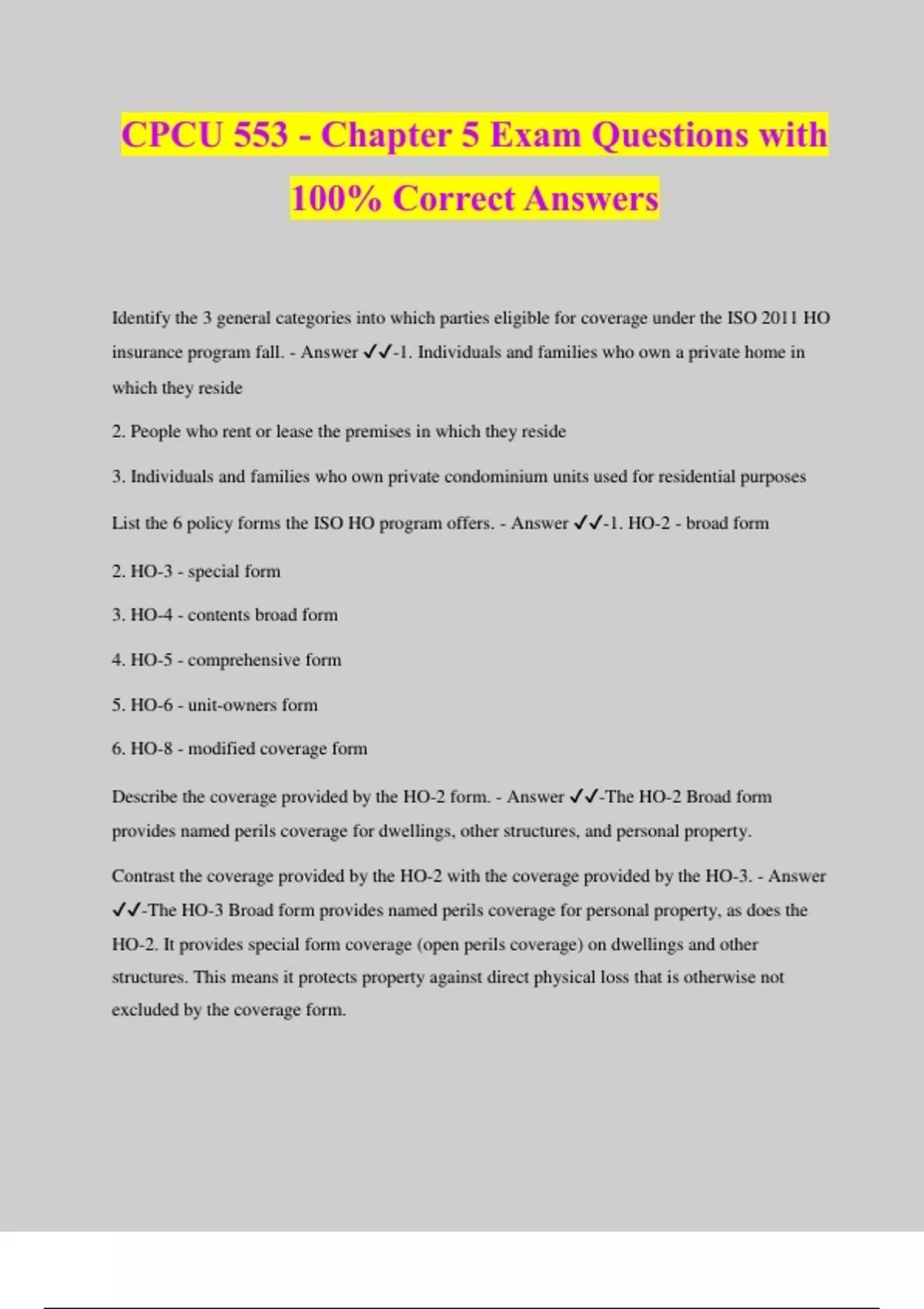 CPCU 553 - Chapter 5 Exam Questions with 100% Correct Answers Identify the 3 general categories into which parties eligible for coverage under the ISO 2011 HO insurance program fall. - Answer ️️ -1. Individuals and families who own a private home in which they reside 2. People who rent or lease the premises in which they reside 3. Individuals and families who own private condominium units used for residential purposes List the 6 policy forms the ISO HO program offers. - Answer ️️ -1. HO-2 - broad form 2. HO-3 - special form 3. HO-4 - contents broad form 4. HO-5 - comprehensive form 5. HO-6 - unit-owners form 6. HO-8 - modified coverage form Describe the coverage provided by the HO-2 form. - Answer ️️ -The HO-2 Broad form provides named perils coverage for dwellings, other structures, and personal property. Contrast the coverage provided by the HO-2 with the coverage provided by the HO-3. - Answer ️️ -The HO-3 Broad form provides named perils coverage for personal property, as does the HO-2. It provides special form coverage (open perils coverage) on dwellings and other structures. This means it protects property against direct physical loss that is otherwise not excluded by the coverage form.