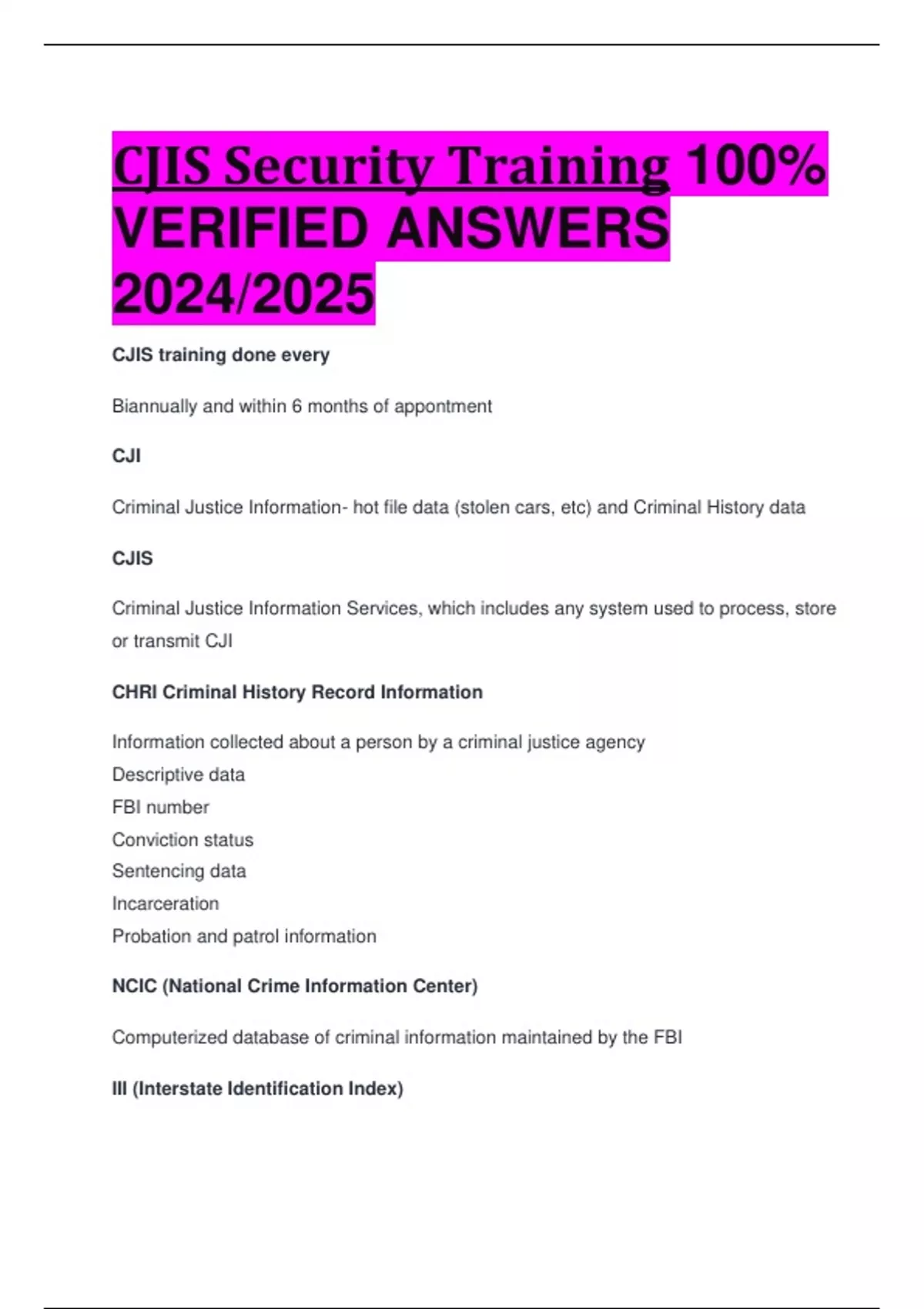 CJIS Security Training 100% VERIFIED ANSWERS 2024/2025