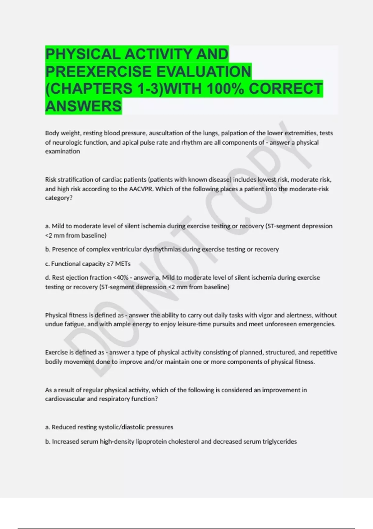 PHYSICAL ACTIVITY AND PREEXERCISE EVALUATION (CHAPTERS 1-3)WITH 100% CORRECT ANSWERS