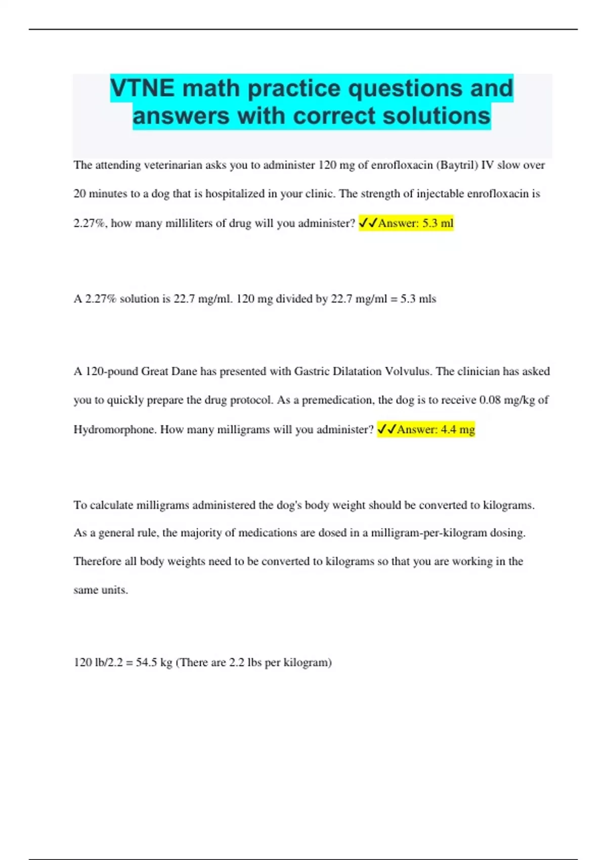 The attending veterinarian asks you to administer 120 mg of enrofloxacin (Baytril) IV slow over 20 minutes to a dog that is hospitalized in your clinic. The strength of injectable enrofloxacin is 2.27%, how many milliliters of drug will you administer? Answer: 5.3 ml A 2.27% solution is 22.7 mg/ml. 120 mg divided by 22.7 mg/ml = 5.3 mls A 120-pound Great Dane has presented with Gastric Dilatation Volvulus. The clinician has asked you to quickly prepare the drug protocol. As a premedication, the dog is to receive 0.08 mg/kg of Hydromorphone. How many milligrams will you administer? Answer: 4.4 mg To calculate milligrams administered the dog's body weight should be converted to kilograms. As a general rule, the majority of medications are dosed in a milligram-per-kilogram dosing. Therefore all body weights need to be converted to kilograms so that you are working in the same units. 120 lb/2.2 = 54.5 kg (There are 2.2 lbs per kilogram)