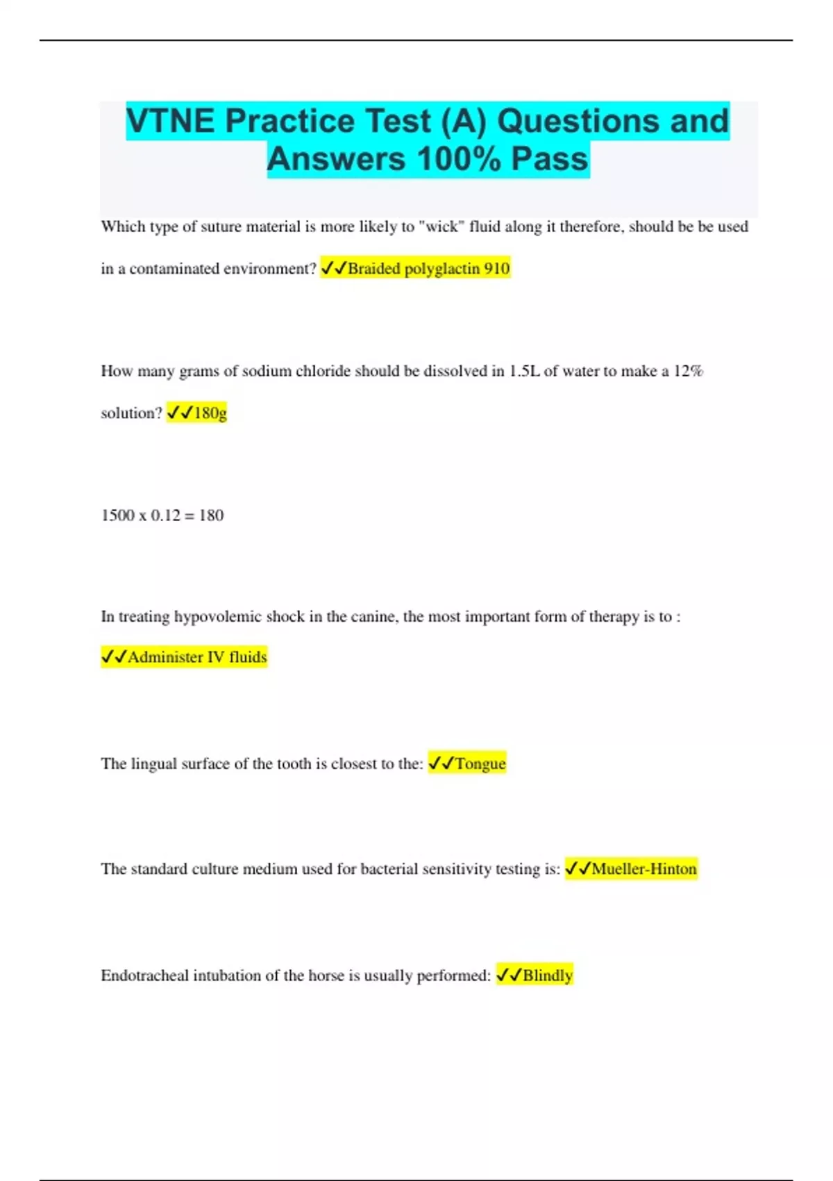 Which type of suture material is more likely to "wick" fluid along it therefore, should be be used in a contaminated environment? Braided polyglactin 910 How many grams of sodium chloride should be dissolved in 1.5L of water to make a 12% solution? 180g 1500 x 0.12 = 180 In treating hypovolemic shock in the canine, the most important form of therapy is to : Administer IV fluids The lingual surface of the tooth is closest to the: Tongue The standard culture medium used for bacterial sensitivity testing is: Mueller-Hinton