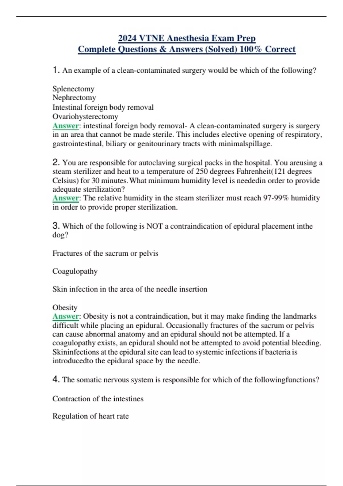 2024 VTNE Anesthesia Exam Prep Complete Questions & Answers (Solved) 100% Correct 1. An example of a clean-contaminated surgery would be which of the following? Splenectomy Nephrectomy Intestinal foreign body removal Ovariohysterectomy Answer: intestinal foreign body removal- A clean-contaminated surgery is surgery in an area that cannot be made sterile. This includes elective opening of respiratory, gastrointestinal, biliary or genitourinary tracts with minimalspillage. 2. You are responsible for autoclaving surgical packs in the hospital. You areusing a steam sterilizer and heat to a temperature of 250 degrees Fahrenheit(121 degrees Celsius) for 30 minutes.What minimum humidity level is neededin order to provide adequate sterilization? Answer: The relative humidity in the steam sterilizer must reach 97-99% humidity in order to provide proper sterilization. 3. Which of the following is NOT a contraindication of epidural placement inthe dog? Fractures of the sacrum or pelvis Coagulopathy Skin infection in the area of the needle insertion Obesity Answer: Obesity is not a contraindication, but it may make finding the landmarks difficult while placing an epidural. Occasionally fractures of the sacrum or pelvis can cause abnormal anatomy and an epidural should not be attempted.If a coagulopathy exists, an epidural should not be attempted to avoid potential bleeding. Skininfections at the epiduralsite can lead to systemic infectionsif bacteria is introducedto the epidural space by the needle. 4. The somatic nervous system is responsible for which of the followingfunctions? Contraction of the intestines Regulation of heart rate