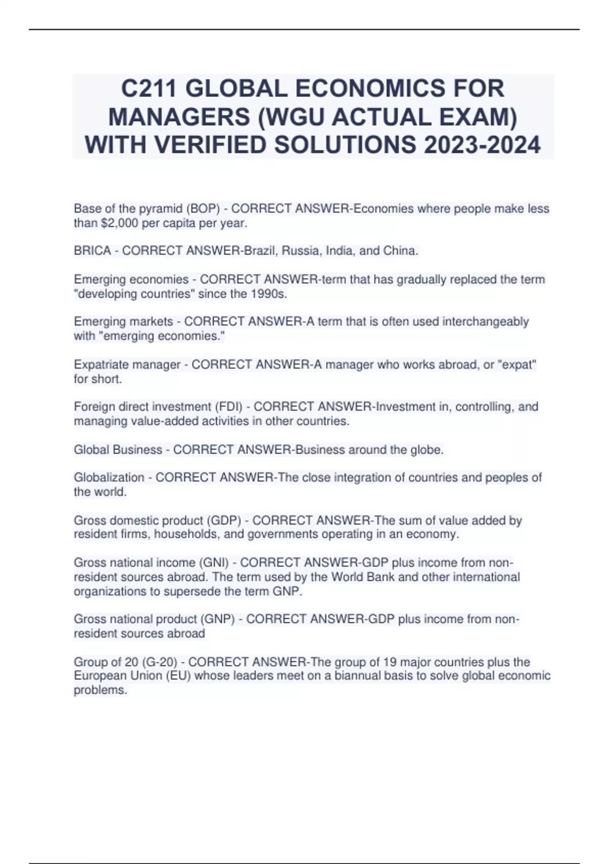resident sources abroad Group of 20 (G -20) - CORRECT ANSWER -The group of 19 major countries plus the European Union (EU) whose leaders meet on a biannual basis to solve global economic problems. International business (IB) - CORRECT ANSWER -(1) A business (or firm) that engages in international (cross -border) economic activities and/or (2) the action of doing business abroad. International premium - CORRECT ANSWER -A significant pay raise when working overseas. Liability of foreignness - CORRECT ANSWER -The inherent disadvantage that foreign firms experience in host countries because of their non -native status. Multinational enterprise (MNE) - CORRECT ANSWER -A firm that engages in foreign direct investment (FDI). Nongovernmental organization (NGO) - CORRECT ANSWER -An organization that is not affiliated with governments. Purchasing power parity (PPP) - CORRECT ANSWER -A conversion that determines the equivalent amount of goods and services that different currencies can purchase. Reverse innovation - CORRECT ANSWER -An innovation that is adopted first in emerging economies and is then diffused around the world. Risk management - CORRECT ANSWER -The identification and assessment of risks and the preparation to minimize the impact of high -risk, unfortunate events. Scenario planning - CORRECT ANSWER -A technique to prepare and plan for multiple scenarios (either high or low risk). Semiglobalization - CORRECT ANSWER -A perspective that suggests that barriers to market integration at borders are high, but not high enough to insulate countries from each other completely. Triad - CORRECT ANSWER -North America, Western Europe, and Japan. Purchasing power parity (PPP) - CORRECT ANSWER -adjustment made to the GDP to reflect differences in the cost of living The bottom billion - CORRECT ANSWER -Concentrated in Africa and Central Asia - 58 small countries, stuck at the bottom in terms of growth, incomes and human development Enhance employability & advance career, better preparation to be expat, competence in interacting with foreign suppliers/partners/competitors/employees - CORRECT ANSWER -Why study global business? Institution -based view - CORRECT ANSWER -A core perspective. Success and failure of firms are constrained by institutions Formal rules - CORRECT ANSWER -requirements that treat domestic and foreign firms as equals enhance the potential odds for foreign firms' success or those that discriminate against foreign firms, would undermine the chances for foreign entrants Informal rules - CORRECT ANSWER -cultures, ethics, and norms play an important part in shaping the success and failure of firms around the globe Resource -based view - CORRECT ANSWER -A core perspective. Success and failure of firms is determined by their environment New force in recent times, a long -running historical evolution, a pendulum swinging between extremes - CORRECT ANSWER -What are the three views of globalization? "Four Tigers" - CORRECT ANSWER -Hong Kong, Singapore, South Korea and Taiwan Absolute advantage - CORRECT ANSWER -The economic advantage one nation enjoys that is absolutely superior to other nations. Administrative policy - CORRECT ANSWER -Bureaucratic rules that make it harder to import foreign goods. antidumping duty - CORRECT ANSWER -Tariffs levied on imports that have been "dumped" (selling below costs to "unfairly" drive domestic firms out of business). Balance of Trade - CORRECT ANSWER -The aggregation of importing and exporting that leads to the country -level trade surplus or deficit. Classical trade theories - CORRECT ANSWER -The major theories of international trade that were advanced before the 20th century, which consist of (1) mercantilism, (2) absolute advantage, and (3) comparative advantage. Comparative advantage - CORRECT ANSWER -Relative (not absolute) advantage in one economic activity that one nation enjoys in comparison with other nations. Deadweight cost - CORRECT ANSWER -Net losses that occur in an economy as a result of tariffs. Export - CORRECT ANSWER -Selling abroad. Factor endowment - CORRECT ANSWER -The extent to which different countries possess various factors of production such as labor, land, and technology.