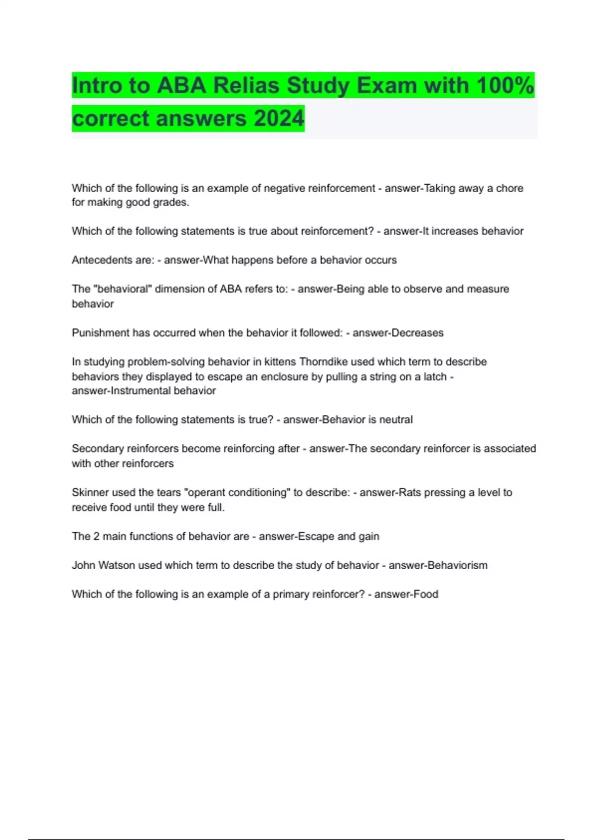 Intro to ABA Relias Study Exam with 100% correct answers 2024