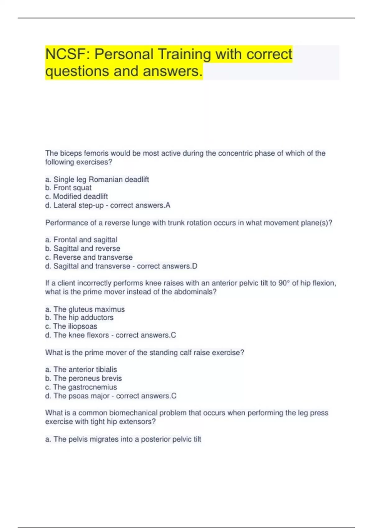 NCSF: Personal Training with correct questions and answers. The biceps femoris would be most active during the concentric phase of which of the following exercises? a. Single leg Romanian deadlift b. Front squat c. Modified deadlift d. Lateral step-up - correct answers.A Performance of a reverse lunge with trunk rotation occurs in what movement plane(s)? a. Frontal and sagittal b. Sagittal and reverse c. Reverse and transverse d. Sagittal and transverse - correct answers.D If a client incorrectly performs knee raises with an anterior pelvic tilt to 90° of hip flexion, what is the prime mover instead of the abdominals? a. The gluteus maximus b. The hip adductors c. The iliopsoas d. The knee flexors - correct answers.C What is the prime mover of the standing calf raise exercise? a. The anterior tibialis b. The peroneus brevis c. The gastrocnemius d. The psoas major - correct answers.C What is a common biomechanical problem that occurs when performing the leg press exercise with tight hip extensors? a. The pelvis migrates into a posterior pelvic tilt b. The knees are forced past the toes c. Cervical spine stress occurs due to neck flexion d. All of the above - correct answers.A Which of the following muscle fiber types maintain the highest concentration of mitochondria to fuel aerobic metabolism? a. Type I b. Type IIa c. Type IIb d. Type Ix - correct answers.A During the upward phase of the barbell back squat, the quadriceps would undergo a(n) __________ contraction? a. Eccentric b. Concentric c. Isometric d. Isokinetic - correct answers.B Which of the following muscles is used to maintain posture and therefore would have the greatest concentration of type I fibers? a. Pectoralis major b. Biceps brachii c. Biceps femoris d. Soleus - correct answers.D Medical clearance is recommended for clients who present with all of the following values except: a. Resting heart rate 100bpm b. Blood pressure of 140/90 mmHg c. Cholesterol ratio ≥ 5 d. Serum triglycerides = 235mg/dl - correct answers.B Males with greater than _____ % body fat and females with greater than _____ % body fat are considered morbidly obese and require a physician's referral prior to exercise testing. a. 20, 30 b. 30, 40 c. 40, 50 d. None of the above - correct answers.B A high level of serum LDL cholesterol is associated with high intake of _____________ fat. - correct answers.Saturated