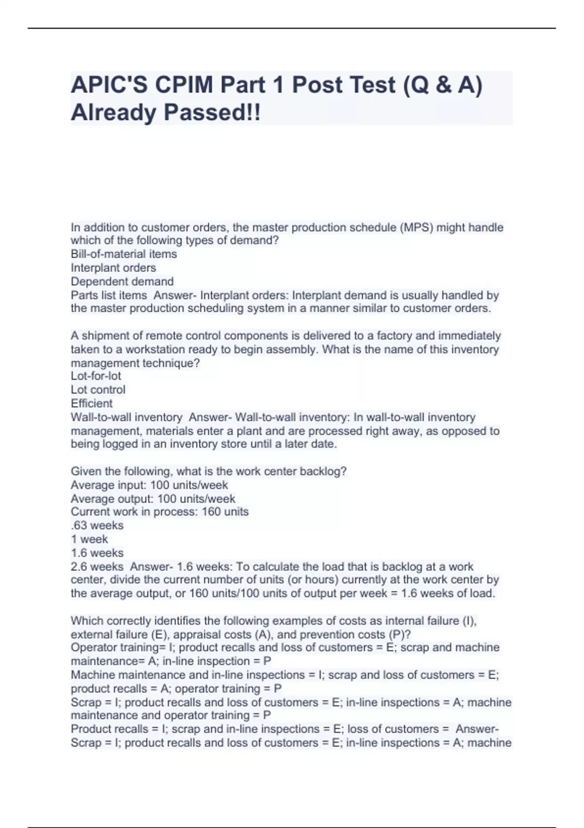 apics cpim part 1 post test q a already passe