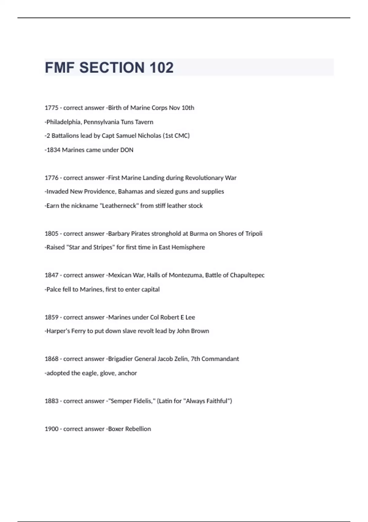 FMF SECTION 102 Question and answers correctly solved 2023/2024 1775 - correct answer -Birth of Marine Corps Nov 10th -Philadelphia, Pennsylvania Tuns Tavern -2 Battalions lead by Capt Samuel Nicholas (1st CMC) -1834 Marines came under DON 1776 - correct answer -First Marine Landing during Revolutionary War -Invaded New Providence
