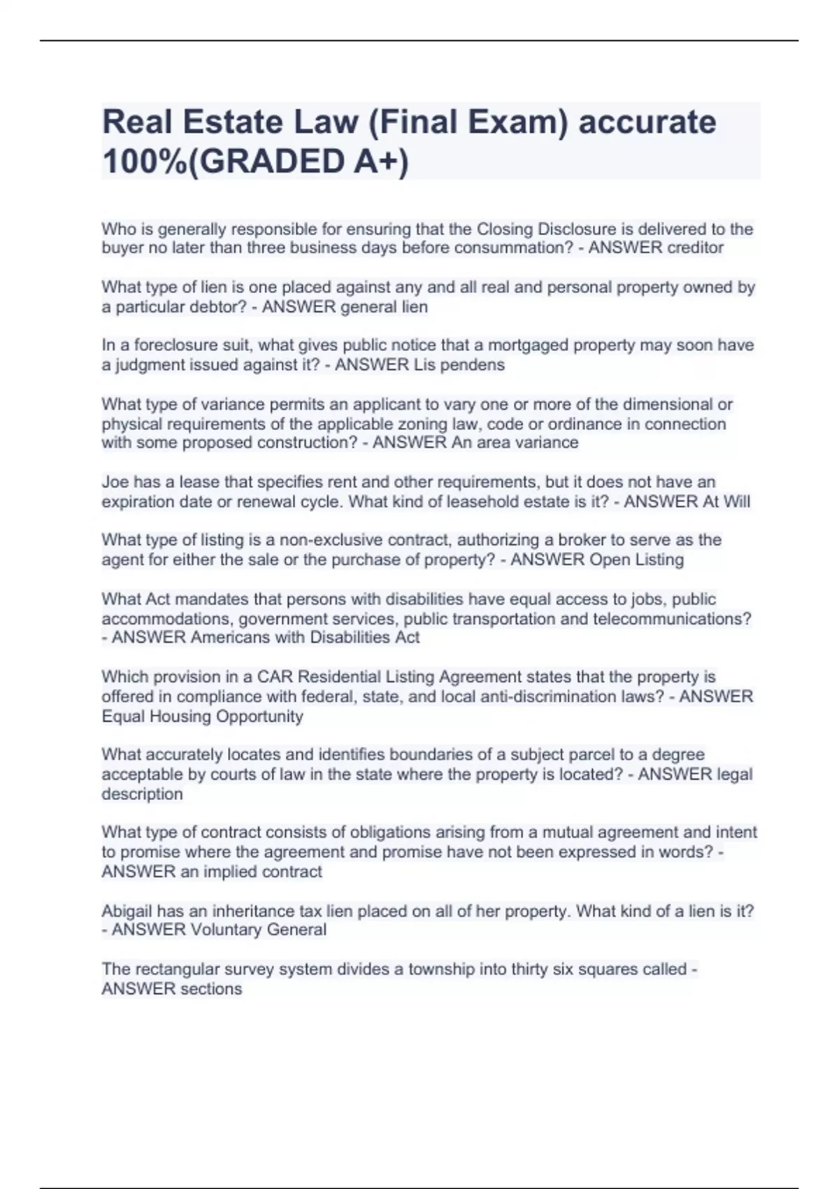 Real Estate Law (Final Exam) accurate 100%(GRADED A+)