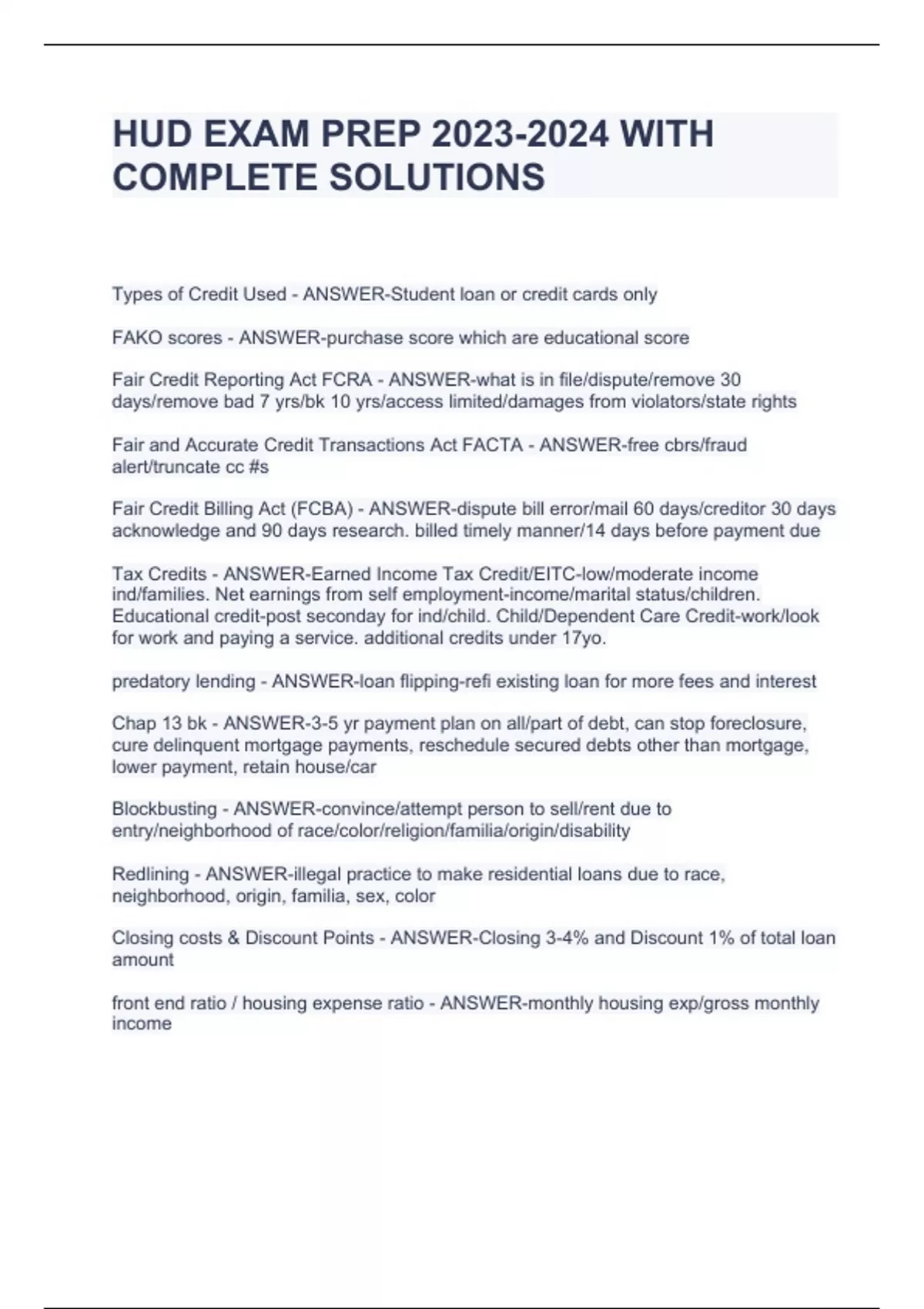 HUD EXAM PREP WITH COMPLETE SOLUTIONS HUD EXAM PREP WITH COMPLETE SOLUTIONS HUD EXAM PREP WITH COMPLETE SOLUTIONS Types of Credit Used - ANSWER-Student loan or credit cards only FAKO scores - ANSWER-purchase score which are educational score Fair Credit Reporting Act FCRA - ANSWER-what is in file/dispute/remove 30 days/remove bad 7 yrs/bk 10 yrs/access limited/damages from violators/state rights