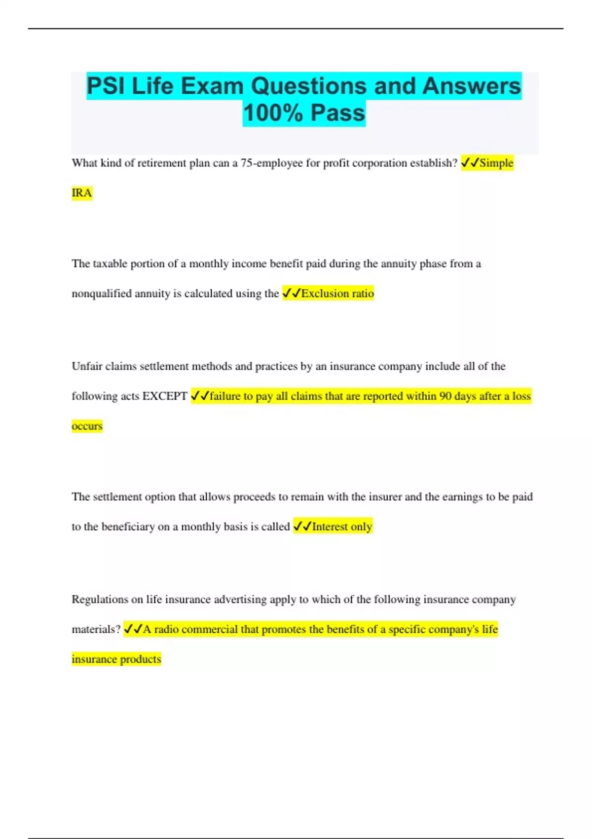 What kind of retirement plan can a 75-employee for profit corporation establish? Simple IRA The taxable portion of a monthly income benefit paid during the annuity phase from a nonqualified annuity is calculated using the Exclusion ratio Unfair claims settlement methods and practices by an insurance company include all of the following acts EXCEPT failure to pay all claims that are reported within 90 days after a loss occurs The settlement option that allows proceeds to remain with the insurer and the earnings to be paid to the beneficiary on a monthly basis is called Interest only Regulations on life insurance advertising apply to which of the following insurance company materials? A radio commercial that promotes the benefits of a specific company's life insurance products