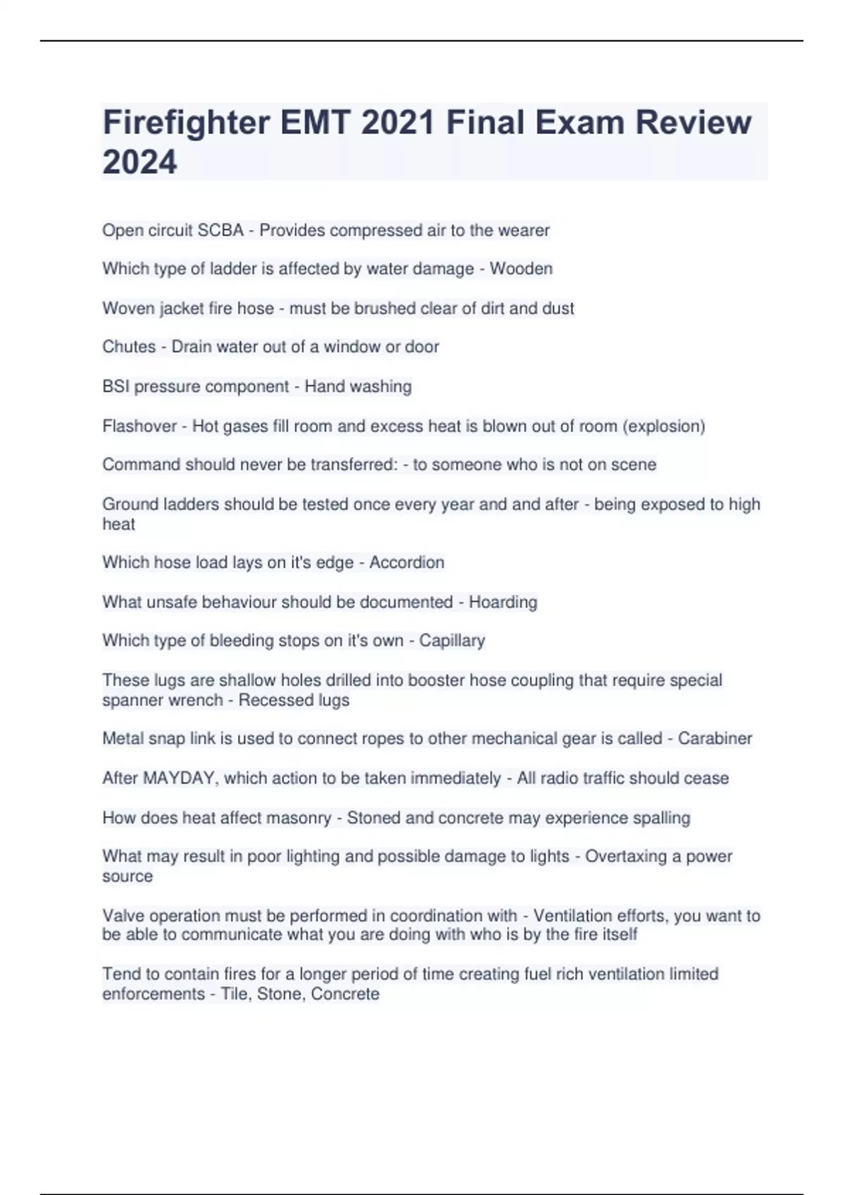 Open circuit SCBA - Provides compressed air to the wearer Which type of ladder is affected by water damage - Wooden Woven jacket fire hose - must be brushed clear of dirt and dust Chutes - Drain water out of a window or door BSI pressure component - Hand washing Flashover - Hot gases fill room and excess heat is blown out of room (explosion) Command should never be transferred: - to someone who is not on scene Ground ladders should be tested once every year and and after - being exposed to high heat Which hose load lays on it's edge - Accordion What unsafe behaviour should be documented - Hoarding Which type of bleeding stops on it's own - Capillary These lugs are shallow holes drilled into booster hose coupling that require special spanner wrench - Recessed lugs Metal snap link is used to connect ropes to other mechanical gear is called - Carabiner After MAYDAY, which action to be taken immediately - All radio traffic should cease How does heat affect masonry - Stoned and concrete may experience spalling What may result in poor lighting and possible damage to lights - Overtaxing a power source Valve operation must be performed in coordination with - Ventilation efforts, you want to be able to communicate what you are doing with who is by the fire itself Tend to contain fires for a longer period of time creating fuel rich ventilation limited enforcements - Tile, Stone, Concrete Asphyxiants, irritants are - toxins Which would you put direct pressure to stop bleeding - knife wound IAP is info based on sizeup and - Creates tactical worksheets, you keep documents on what you find An atmosphere is considered hazardous if Hazard gas is within 10 percent of hazardous materials - Lower Explosive Limit Firefighters have the authority to protect the public but - Must still follow SOPs and laws Which ventilation requires additional personnel and equipment - mechanical Which search method does the leader remain at a fixed point - Oriented Search Method Which type of alarm consists of scrolling message board and pagers - Combination Which component of protective coat is designed to make firemen more visible at night - Reflective trim Once it is determined that collapse is imminent - Zone must be cleared immediately A __ is a group of personnel and resources that assemble to meet a specific mission - Task force Once an LPG (Liquid Propane Gas) fire emergency has been determined firemen should not - Open the valve Which preconnected hose load has hose folds that are laid into the hose bed in an S shape - Triple Layer Load What are attached to the hard suction hose during drafting operations in order to prevent debris from entering pump - Intake strainer What does an extension ladder size class indicate - It's full length it can be extended Step 2 of APIE (HAZMAT) - Use information to determine what actions need to be taken What does APIE stand for? - Assess, Plan, Implement, Evaluate What should be done after doffing SCBA - Close cylinder valve Which type of factory built homes are assembled on site from foam insulated between sheets of plywood - modular homes