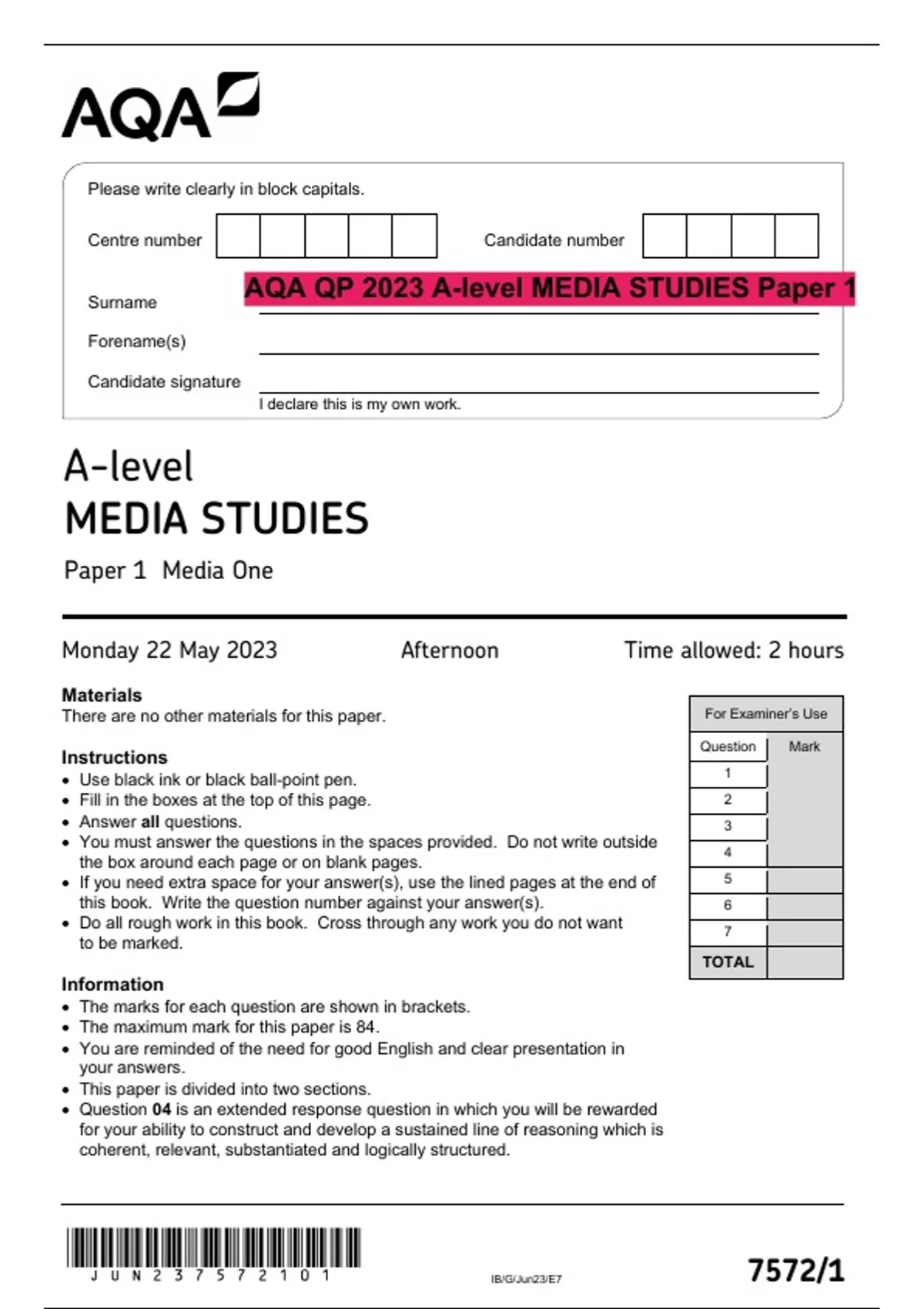 AQA QP 2023 A-level MEDIA STUDIES Paper 1