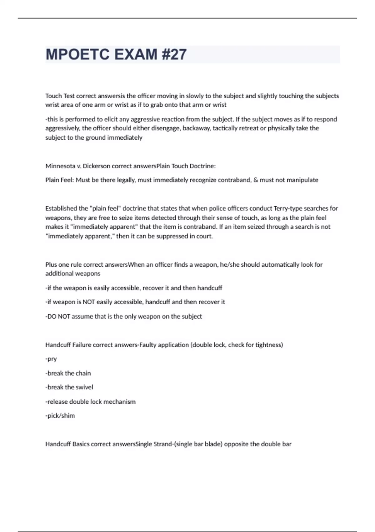 Touch Test correct answersis the officer moving in slowly to the subject and slightly touching the subjects wrist area of one arm or wrist as if to grab onto that arm or wrist -this is performed to elicit any aggressive reaction from the subject. If the subject moves as if to respond aggressively, the officer should either disengage, backaway, tactically retreat or physically take the subject to the ground immediately Minnesota v. Dickerson correct answersPlain Touch Doctrine: Plain Feel: Must be there legally, must immediately recognize contraband, & must not manipulate Established the "plain feel" doctrine that states that when police officers conduct Terry-type searches for weapons, they are free to seize items detected through their sense of touch, as long as the plain feel makes it "immediately apparent" that the item is contraband. If an item seized through a search is not "immediately apparent," then it can be suppressed in court. Plus one rule correct answersWhen an officer finds a weapon, he/she should automatically look for additional weapons -if the weapon is easily accessible, recover it and then handcuff -if weapon is NOT easily accessible, handcuff and then recover it -DO NOT assume that is the only weapon on the subject Handcuff Failure correct answers-Faulty application (double lock, check for tightness) -pry -break the chain -break the swivel -release double lock mechanism -pick/shim Handcuff Basics correct answersSingle Strand-(single bar blade) opposite the double bar