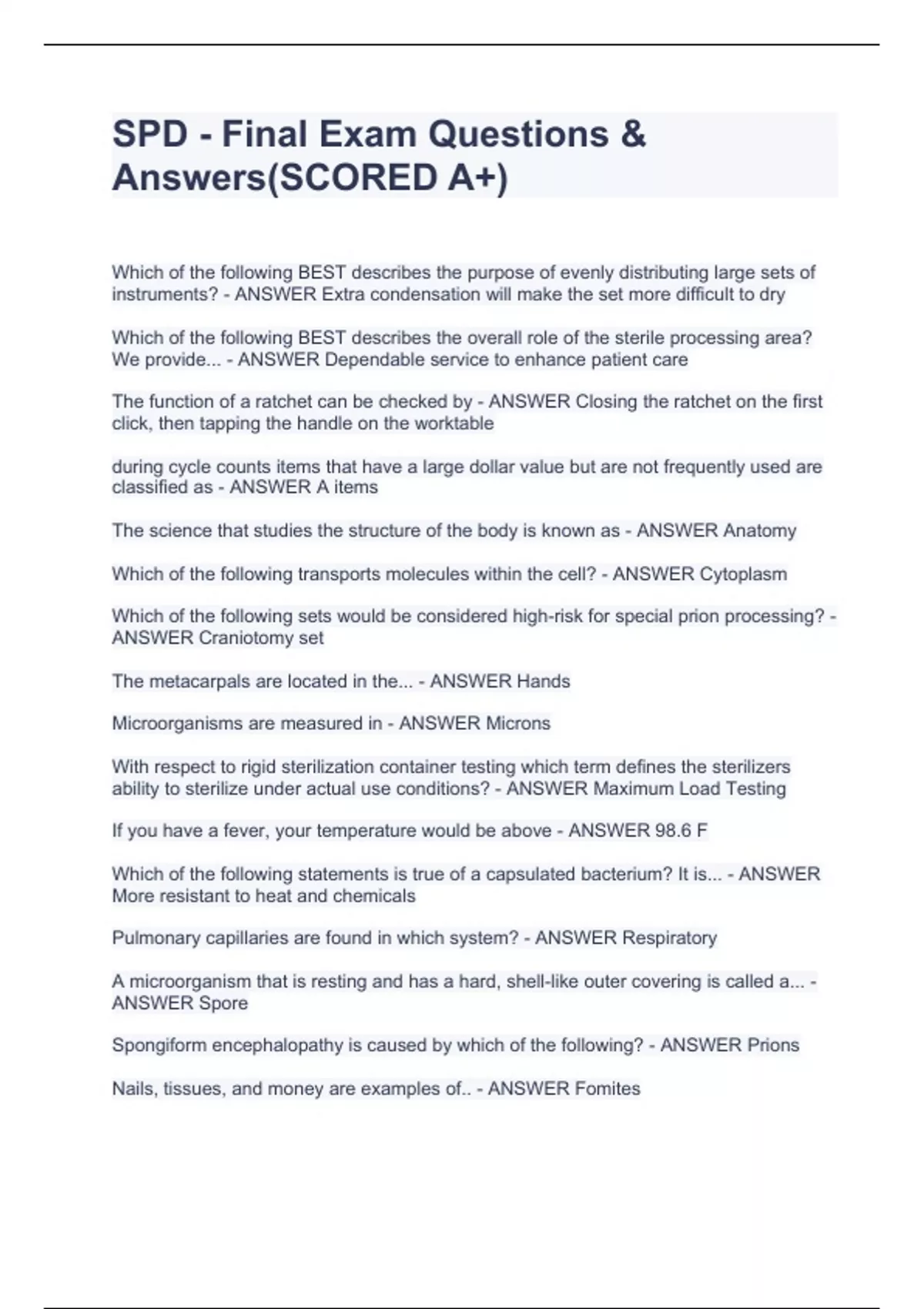Which of the following BEST describes the purpose of evenly distributing large sets of instruments? - ANSWER Extra condensation will make the set more difficult to dry Which of the following BEST describes the overall role of the sterile processing area? We provide... - ANSWER Dependable service to enhance patient care The function of a ratchet can be checked by - ANSWER Closing the ratchet on the first click, then tapping the handle on the worktable during cycle counts items that have a large dollar value but are not frequently used are classified as - ANSWER A items The science that studies the structure of the body is known as - ANSWER Anatomy Which of the following transports molecules within the cell? - ANSWER Cytoplasm Which of the following sets would be considered high-risk for special prion processing? - ANSWER Craniotomy set The metacarpals are located in the... - ANSWER Hands Microorganisms are measured in - ANSWER Microns With respect to rigid sterilization container testing which term defines the sterilizers ability to sterilize under actual use conditions? - ANSWER Maximum Load Testing If you have a fever, your temperature would be above - ANSWER 98.6 F Which of the following statements is true of a capsulated bacterium? It is... - ANSWER More resistant to heat and chemicals Pulmonary capillaries are found in which system? - ANSWER Respiratory A microorganism that is resting and has a hard, shell-like outer covering is called a... - ANSWER Spore Spongiform encephalopathy is caused by which of the following? - ANSWER Prions Nails, tissues, and money are examples of.. - ANSWER Fomites The Zika virus is transmitted by... - ANSWER Vectors In the final step of hand washing, the fingers should be rinsed with the fingertips... - ANSWER Up Waterless hand antiseptics contain what percentage concentration of alcohol to make them MOST effective? - ANSWER 60-95% All of the following play a role in how bones support other body systems except: - ANSWER Distribution of hormones The Occupational Safety and Health Administration requires that transport containers for potentially infectious materials be: - ANSWER Leak proof Flagella helps bacteria to - ANSWER Propel through liquid media The removal of contamination from an item to the extent necessary for further processing is called: - ANSWER Cleaning Which of the following should be cleaned daily? - ANSWER Floors and work surfaces Select the following statement that is TRUE about the use of personal protective equipment in the decontamination area: - ANSWER Failure to wear PPE can result in disciplinary action Before a medical device is cleaned and processed.. - ANSWER The manufacturer's instructions must be obtained. Which of the following additional chemicals is recommended when a high-alkaline detergent is used in a mechanical washer? - ANSWER Neutralizing acid Higher al