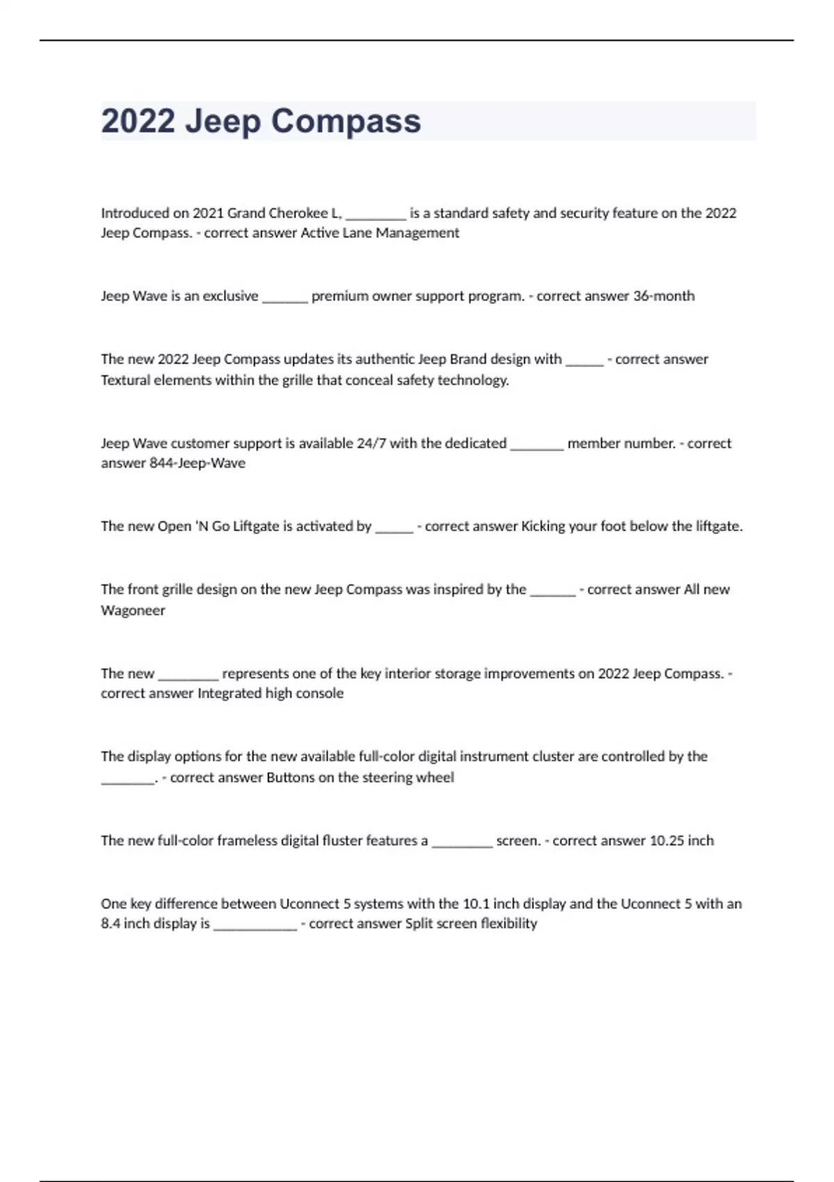 2022 Jeep Compass(UPDATED) Question and answers already passed Introduced on 2021 Grand Cherokee L, ________ is a standard safety and security feature on the 2022 Jeep Compass. - correct answer Active Lane Management Jeep Wave is an exclusive ______ premium owner support program. - correct answer 36-month The new 2022 Jeep Compass updates its authentic Jeep Brand design with _____ - correct answer Textural elements within the grille that conceal safety technology. Jeep Wave customer support is available 24/7 with the dedicated _______ member number. - correct answer 844-Jeep-