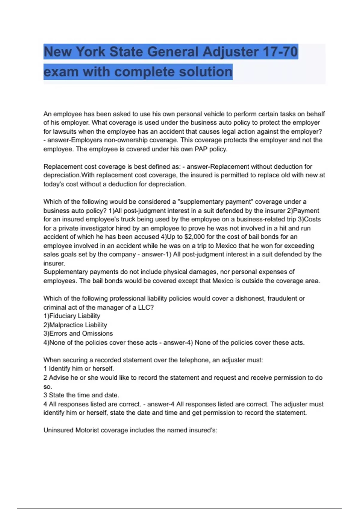 New York State General Adjuster 17-70 exam with complete solution