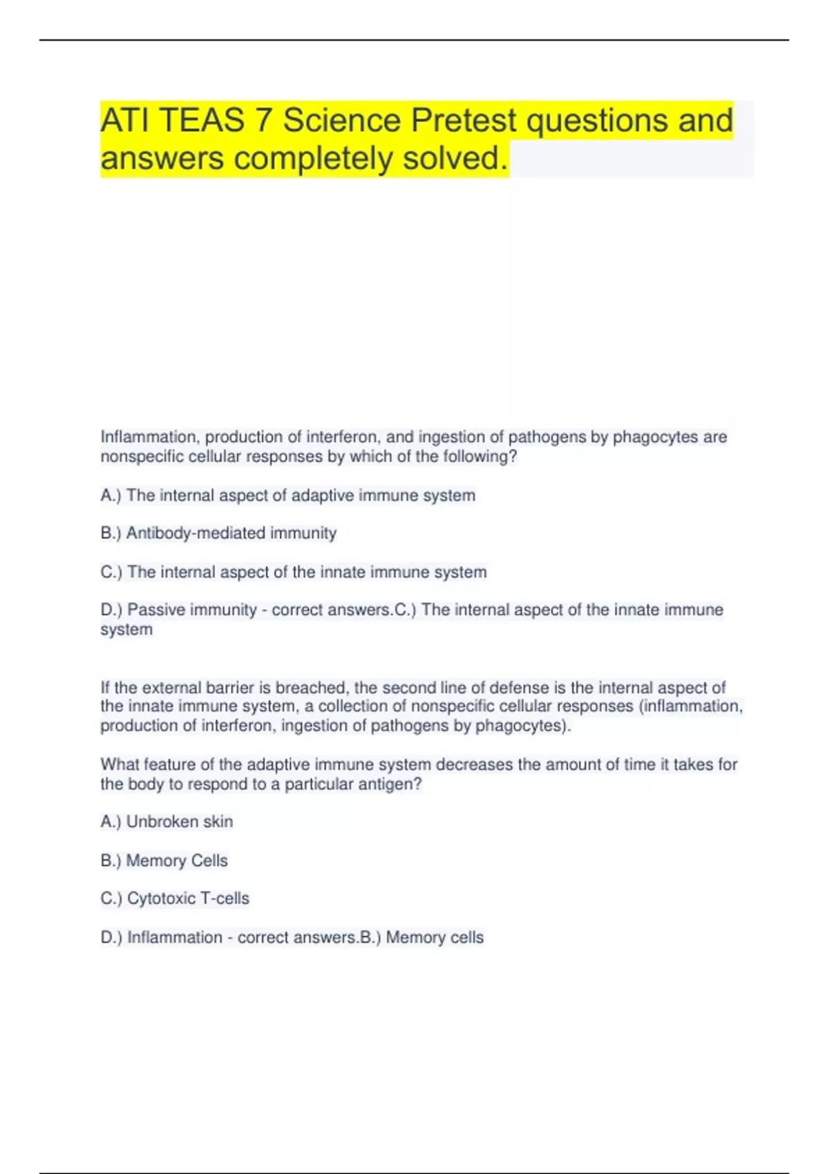 ATI TEAS 7 Science Pretest questions and answers completely solved. Inflammation, production of interferon, and ingestion of pathogens by phagocytes are nonspecific cellular responses by which of the following? A.) The internal aspect of adaptive immune system B.) Antibody-mediated immunity C.) The internal aspect of the innate immune system D.) Passive immunity - correct answers.C.) The internal aspect of the innate immune system If the external barrier is breached, the second line of defense is the internal aspect of the innate immune system, a collection of nonspecific cellular responses (inflammation, production of interferon, ingestion of pathogens by phagocytes). What feature of the adaptive immune system decreases the amount of time it takes for the body to respond to a particular antigen? A.) Unbroken skin B.) Memory Cells C.) Cytotoxic T-cells D.) Inflammation - correct answers.B.) Memory cells Memory cells are a type of lymphocyte that responds more quickly to an antigen upon reintroduction of the pathogen. Which of the following occurs in the cardiac cycle if the impulse triggered a at the sinoatrial mode never reaches the Purkinje fibers of the heart? A.) The atria will not contract. B.) There will be an absence of systole. C.) The ventricles will not contract. D.) Diastole will shorten in duration. - correct answers.C.) The ventricles will not contract. The Purkinje fiber impulse causes the contraction of the ventricles. Which of the following describes the link between damages villi and malnutrition? A.) Damaged villi decrease the nutrient-absorbing surface area in the gastrointestinal tract. B.) If villi are damaged, the surface area of the stomach is decreased. C.)Peristalsis of the large intestine will be diminished. D.) Damaged villi cause gastric reflux disease. - correct answers.A.) Damaged villi decrease the nutrient-absorbing surface area in the gastrointestinal tract. Villi of the small intestine provide a greater nutrient-absorbing surface area in the gastrointestinal tract. Which of the following organs is responsible for the majority of the chemical digestion and absorption of nutrients in the digestive system? A.) Large intestine B.) Small intestine C.) Liver D.) Pancreas - correct answers.B.) Small intestine The primary function of the small intestine is chemical digestion and absorption of nutrients. Contraction occurs within the thin _______ filaments slide past the thicker ______ filaments, causing the sarcomere unit to shorten or contract. A.) actin; myosin B.) myosin; axon C.) axon; actin D.) dendrite; axon - correct answers.A.) actin; myosin Actin and myosin slide past each other, and the sarcomere unit shrinks. The endocrine system is a collection of ductless glands that produce which of the following responses? A.) A quickly initiating but prolonged response on other body systems. B.) A slowly initiating and short response on other body systems C.) A quickly initiating and short response on other body systems D.) A slowly initiating but prolonged response on other body systems. - correct answers.D.) A slowly initiating but prolonged response on other body systems. The endocrine system does not use ducts to deliver glandular products. Endocrine hormones produce a slowly initiating response. However, the response is prolonged. Which of the following terms refers to the middle layer of the skin that is made of connective tissue? A.) Hypodermis B.) Keratin C.) Dermis D.) Epidermis - correct answers.C.) Dermis The dermis is the middle layer of skin that is made of connective tissue.